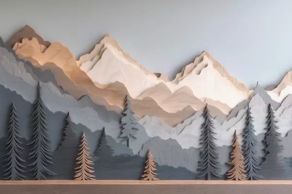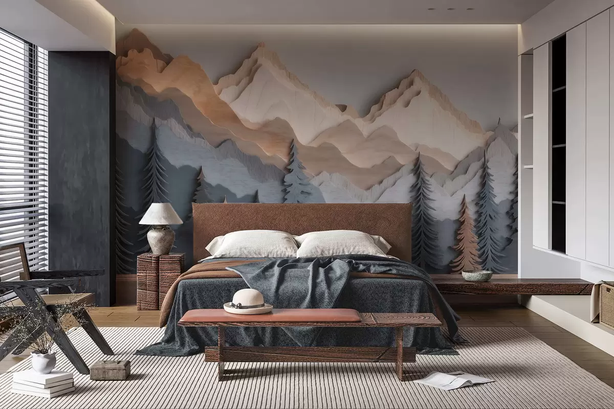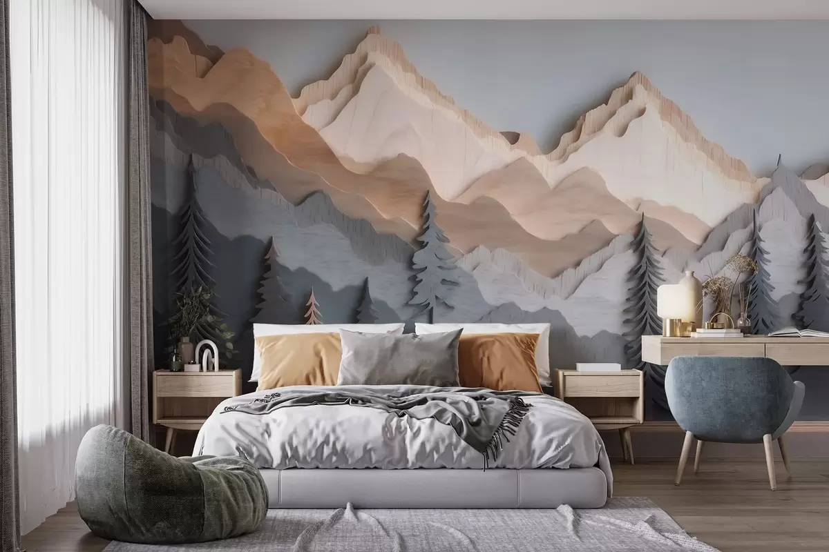 Fotomurales Paisaje natural con pinos y montañas, en estilo de madera tallada Nr. w09793