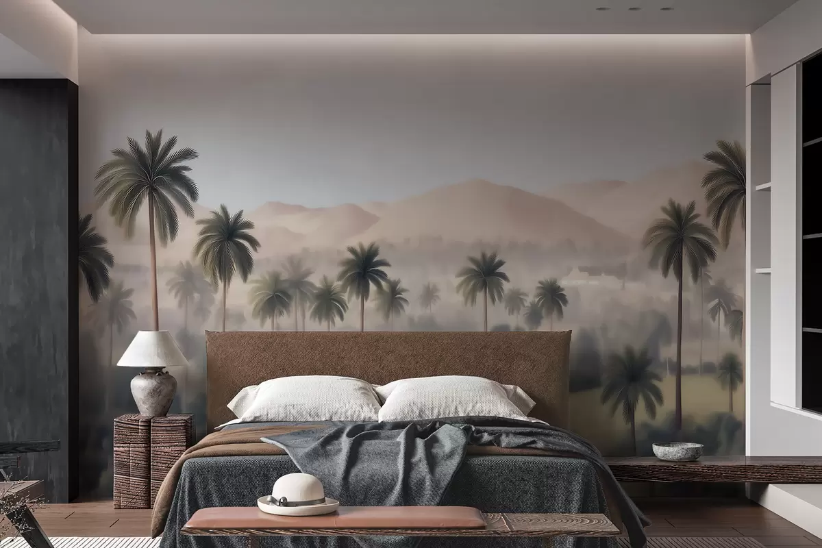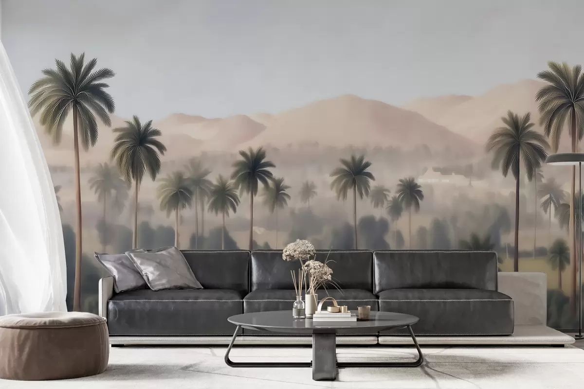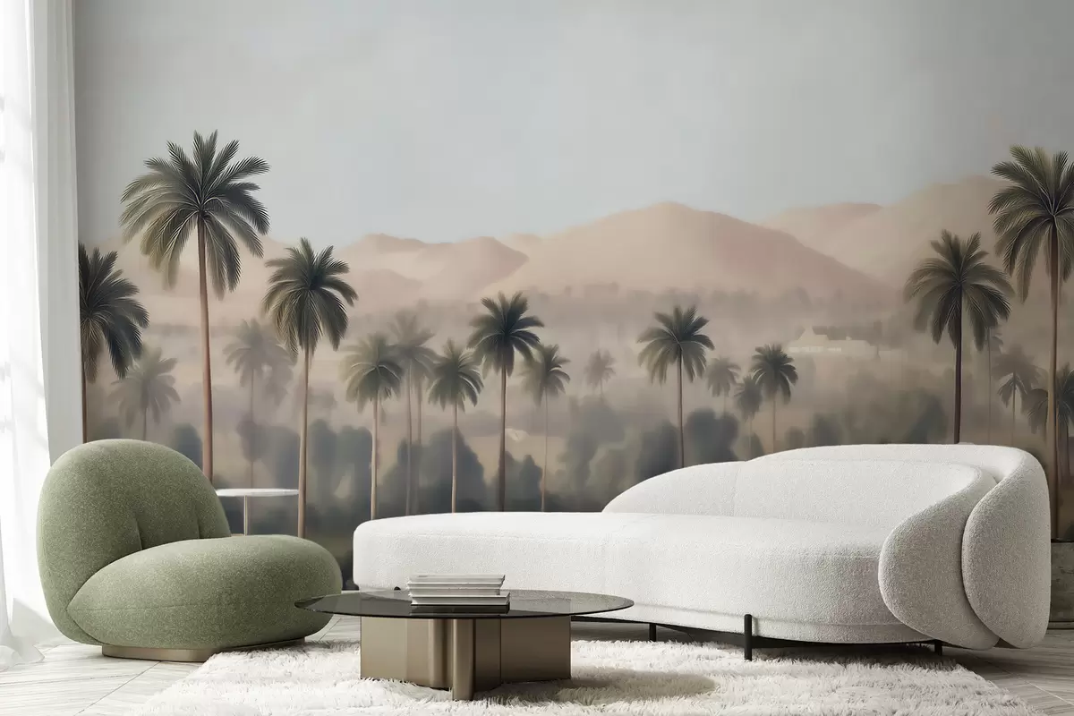 Fotomurales Paisaje tropical con palmeras y montañas, panorámica de estilo vintage en tonos beige y verdes Nr. w09798