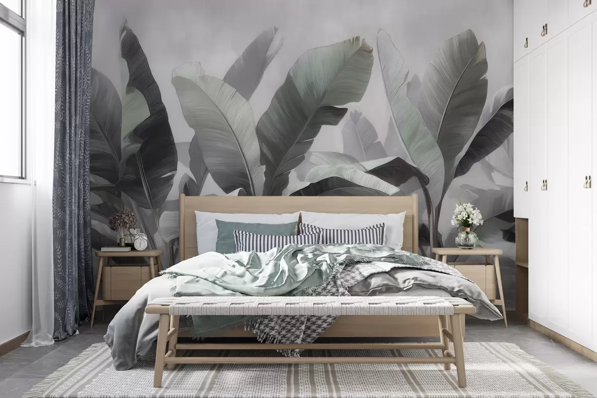 Fotomurales Hojas de plátano tropicales de gran tamaño en una paleta neutra con suaves tonos gris verdosos Nr. w09805