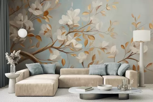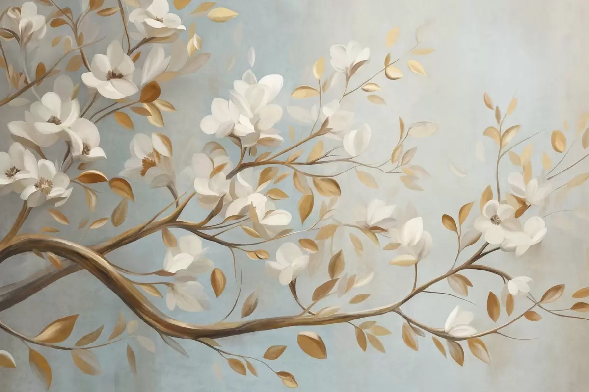 Fotomurales Rama de árbol con textura, flores blancas y hojas amarillas, estilo vintage Nr. w09814