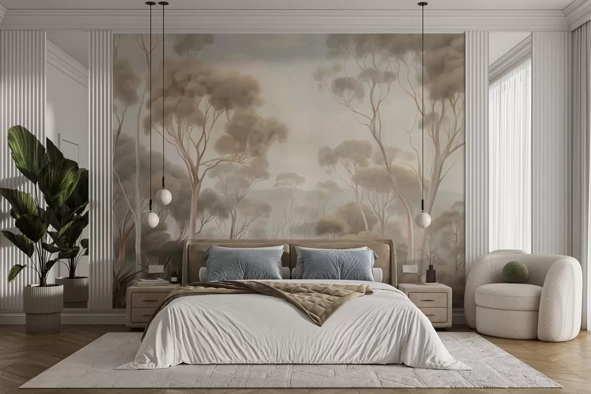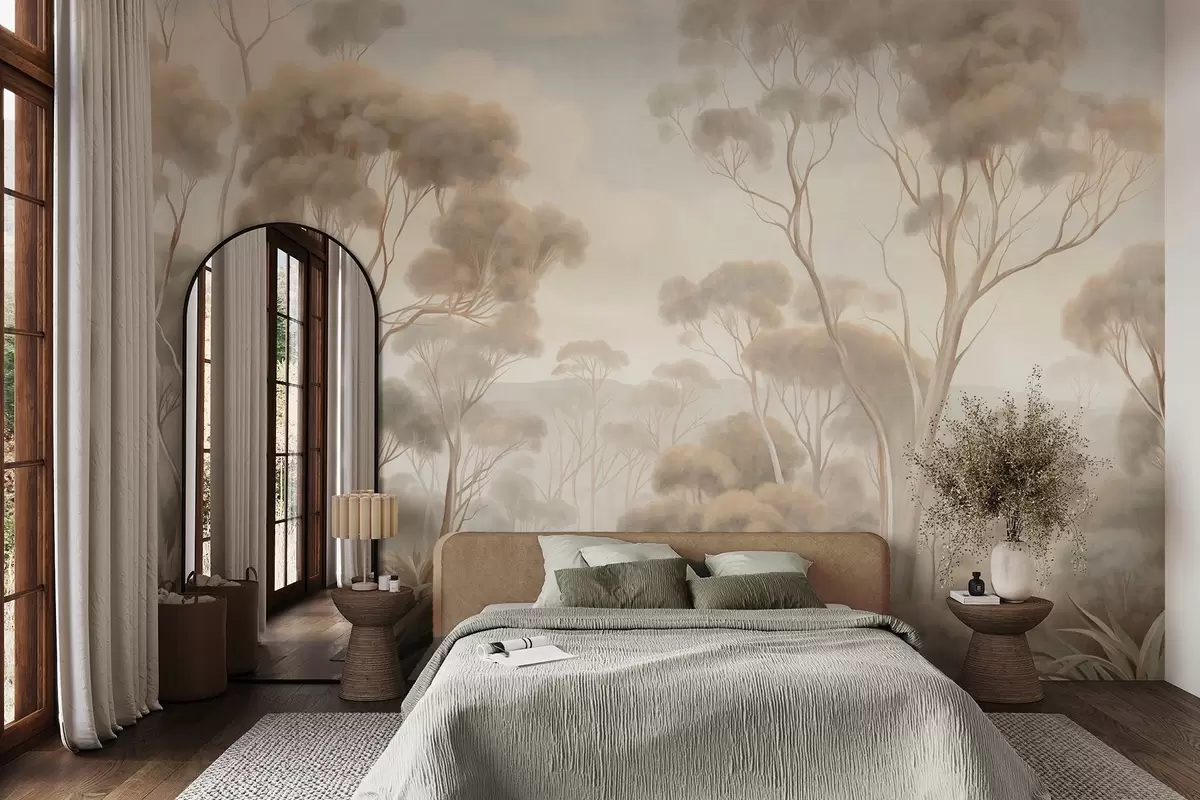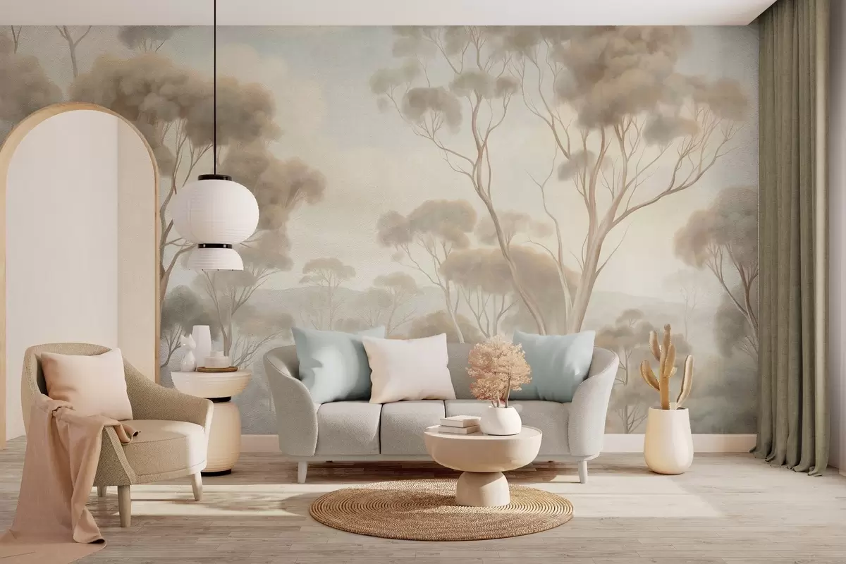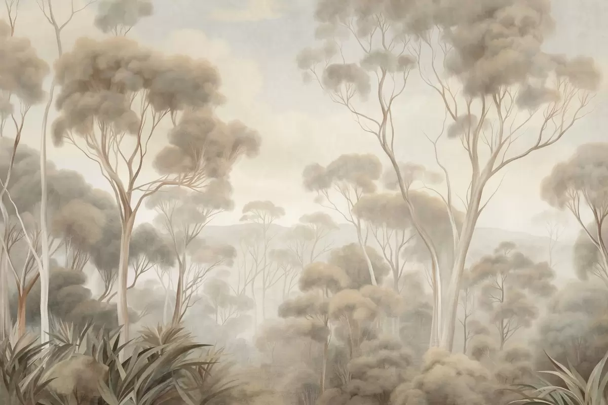 Fotomurales Un paisaje boscoso envuelto en niebla con altos eucaliptos, colinas onduladas bajo un cielo nublado; obra de arte con textura Nr. w09822