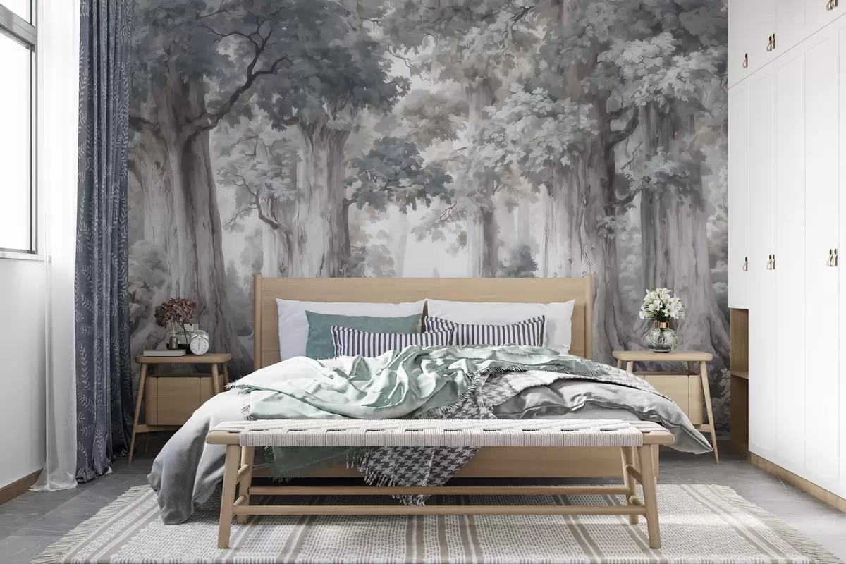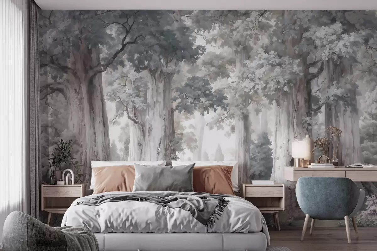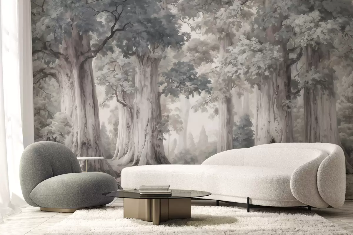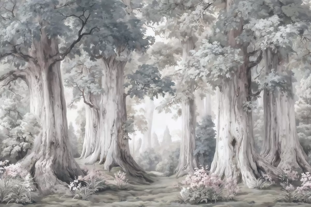 Fotomurales Un bosque de cuento de hadas con árboles altos y una paleta de colores suaves y tenues, al estilo de la acuarela Nr. w09849