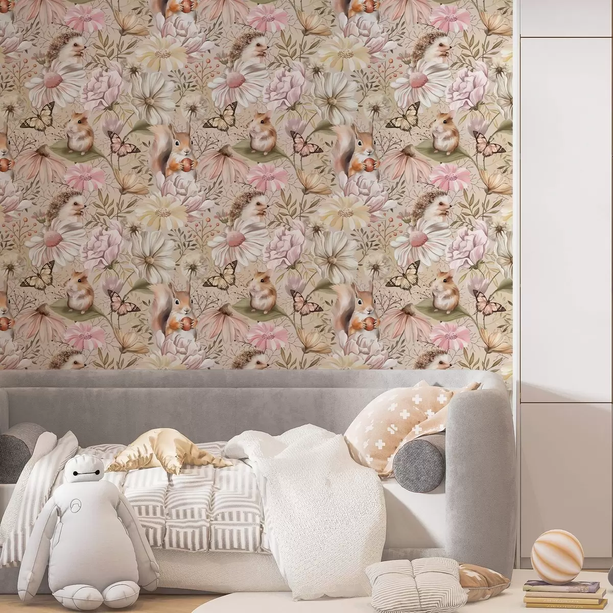 Papel tapiz Simpático erizo, ardilla, hámster y mariposas con flores en colores pastel Nr. a00051