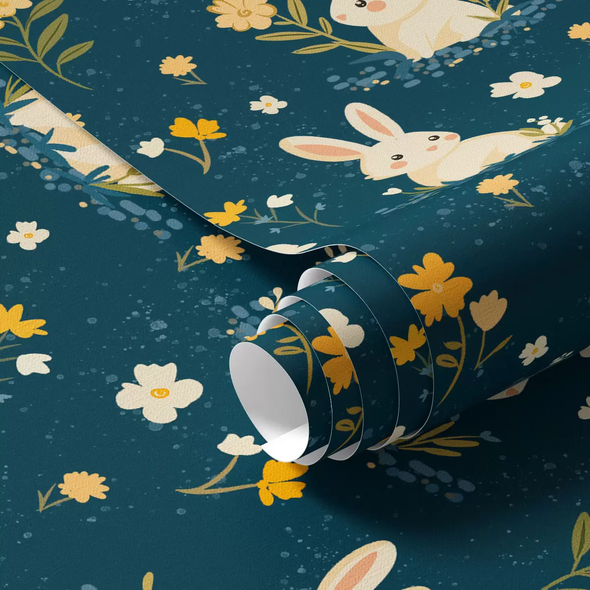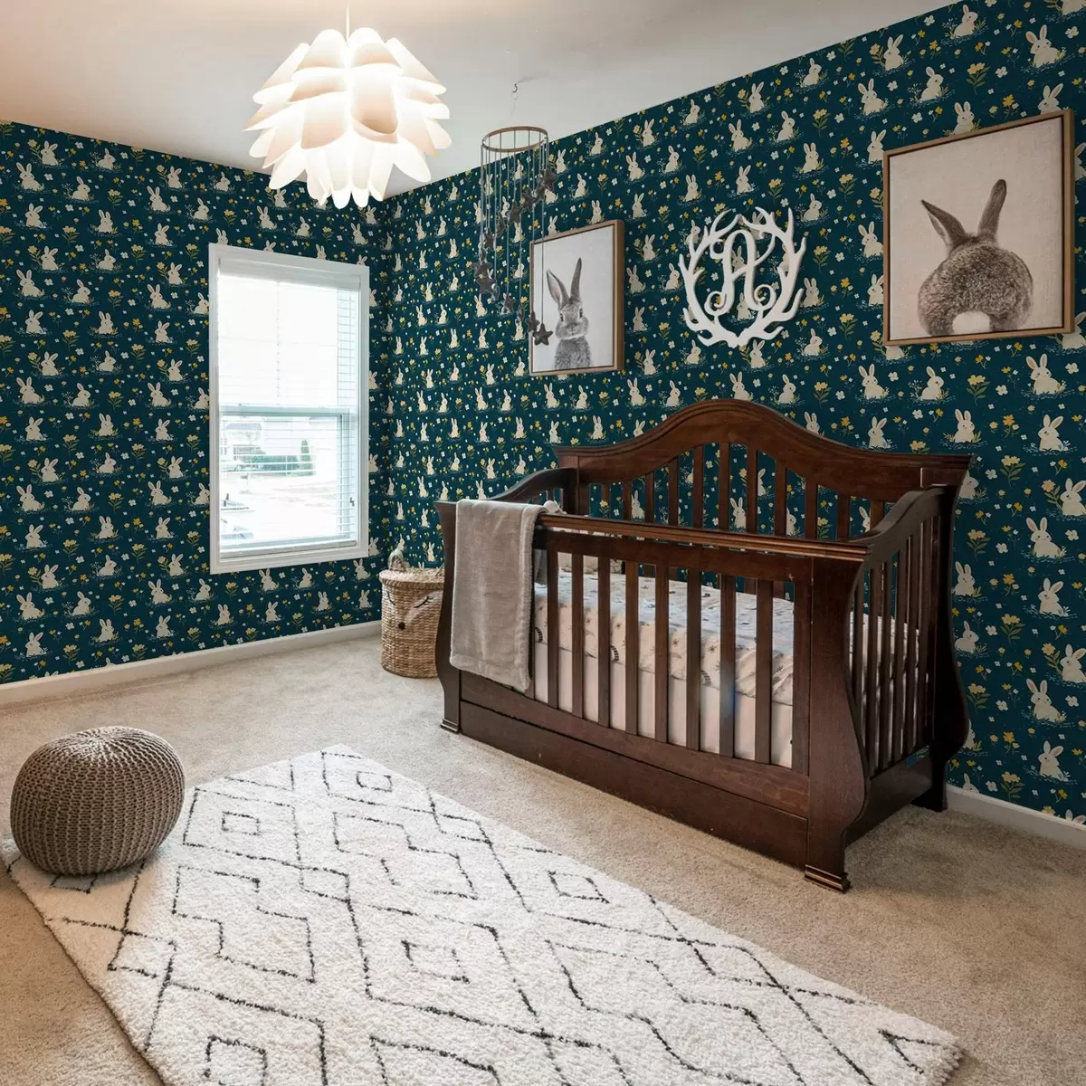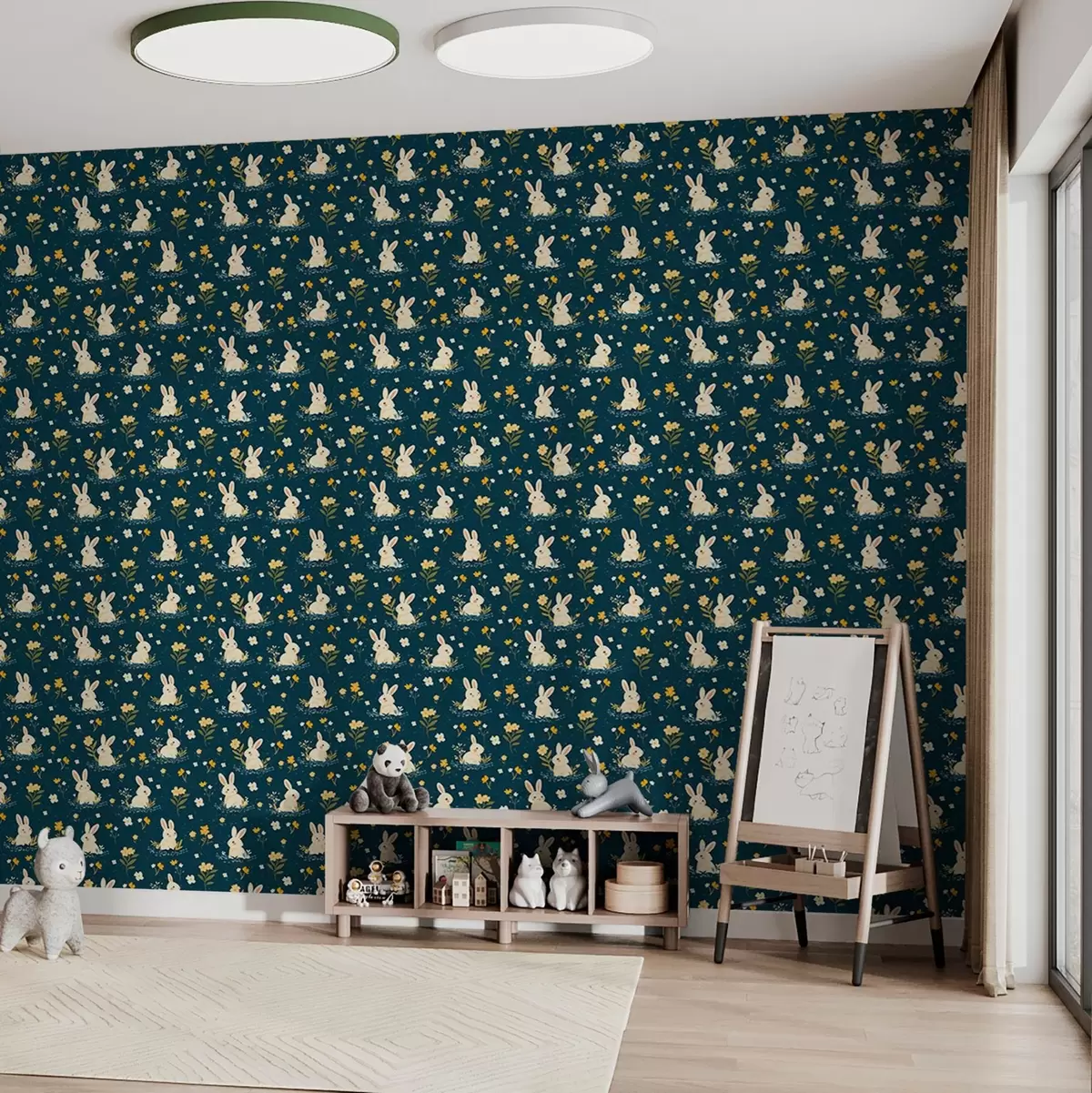 Papel tapiz Conejos en hierba y flores sobre fondo oscuro Nr. a00080