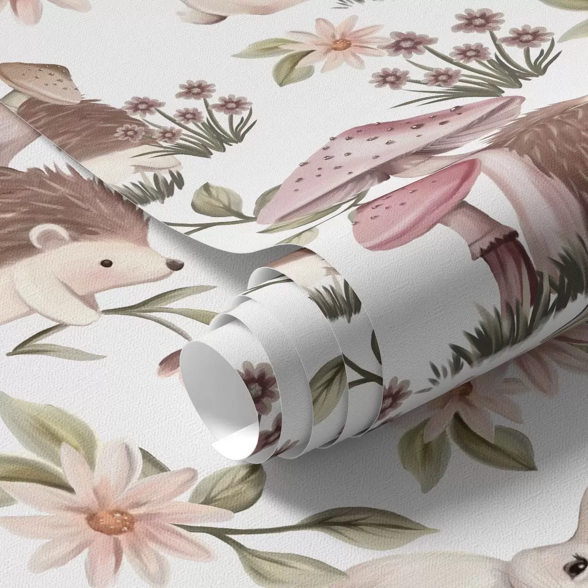 Papel tapiz Erizos y conejos sobre fondo blanco con delicadas flores y setas Nr. a00111v2