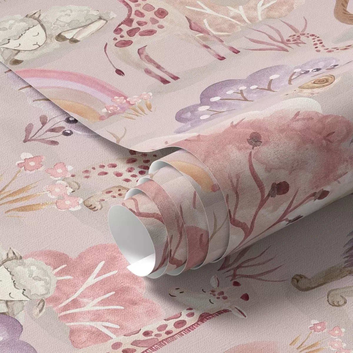 Papel tapiz Cachorros de león, jirafas y arco iris en un bosque de colores pastel Nr. a00112