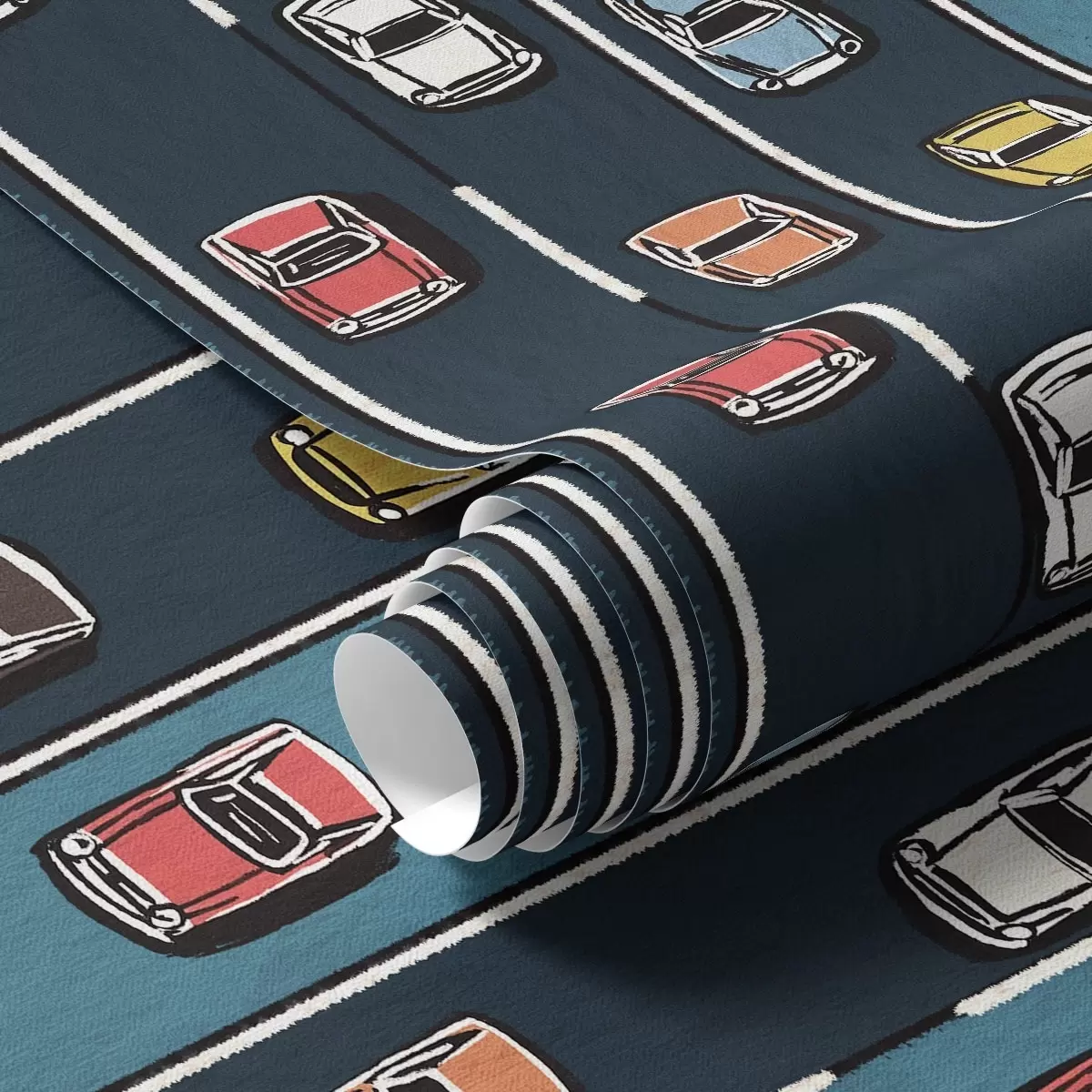 Papel tapiz Coche retro en carretera azul marino al estilo de los años 60 Nr. a00118