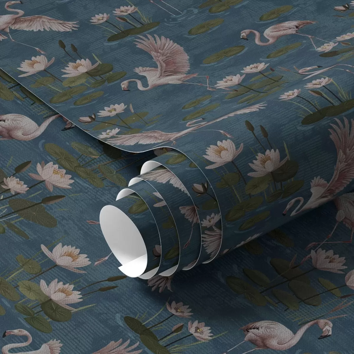 Papel tapiz Flamenco entre nenúfares, escena tropical sobre fondo azul marino Nr. a00237