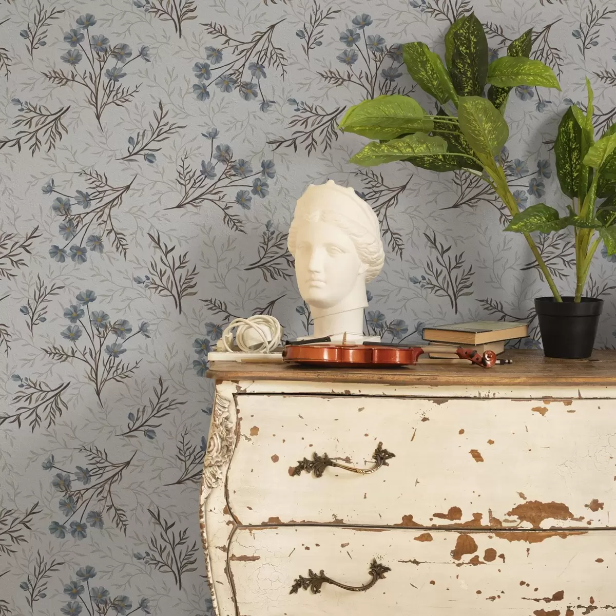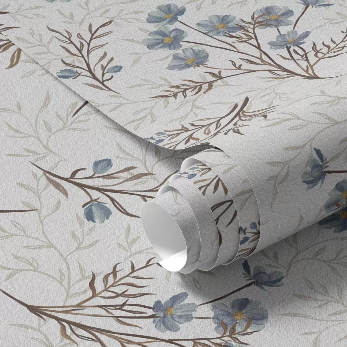 Papel tapiz Flores azules y ramas claras sobre fondo blanco Nr. a00265v1