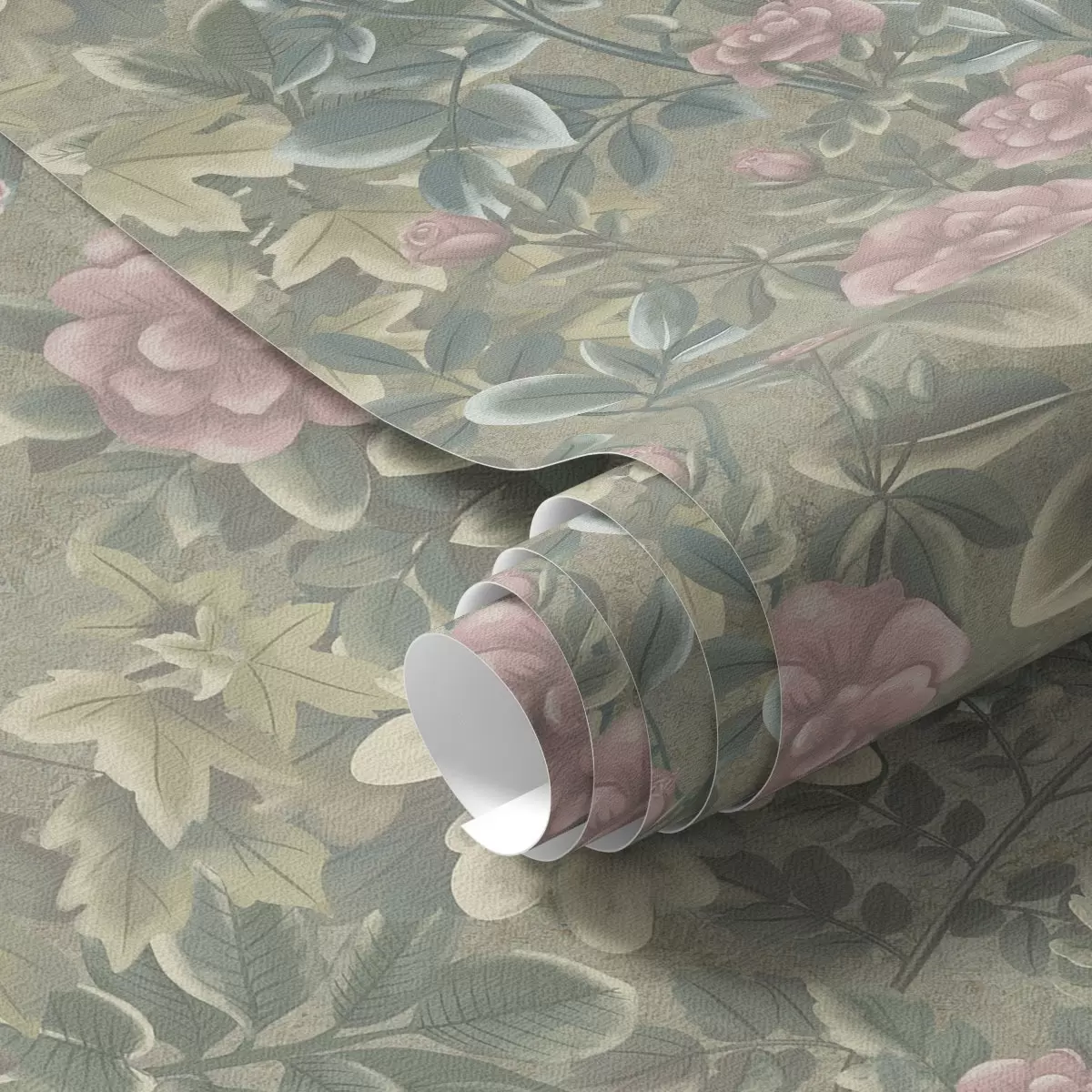 Papel tapiz Flores y hojas rosas sobre fondo verde pastel Nr. a00306