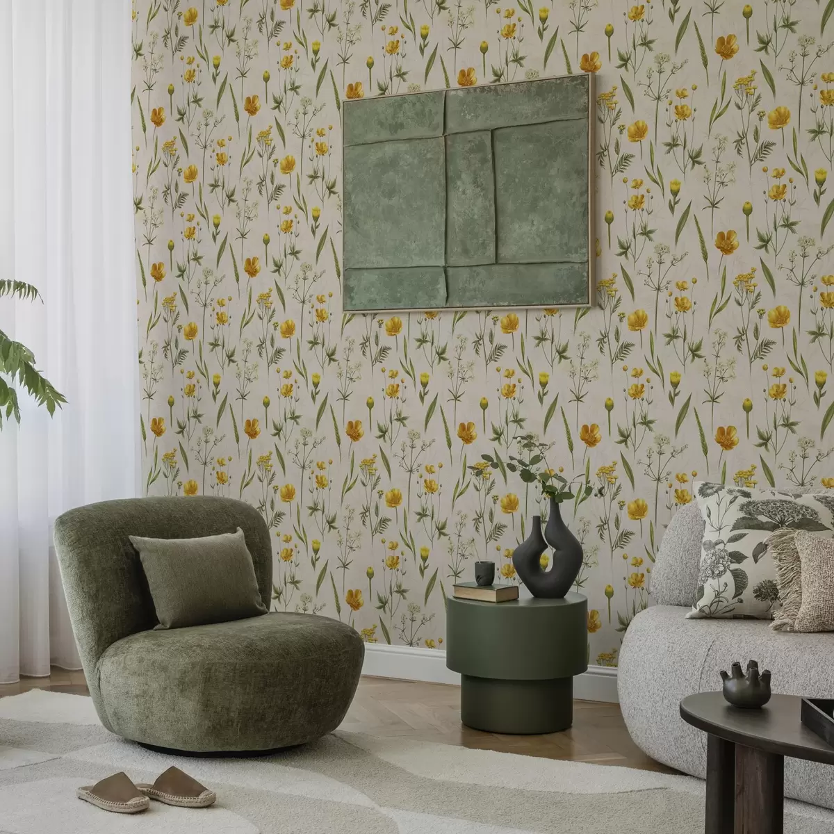 Papel tapiz Flores amarillas y verdes sobre fondo beige Nr. a00472v2