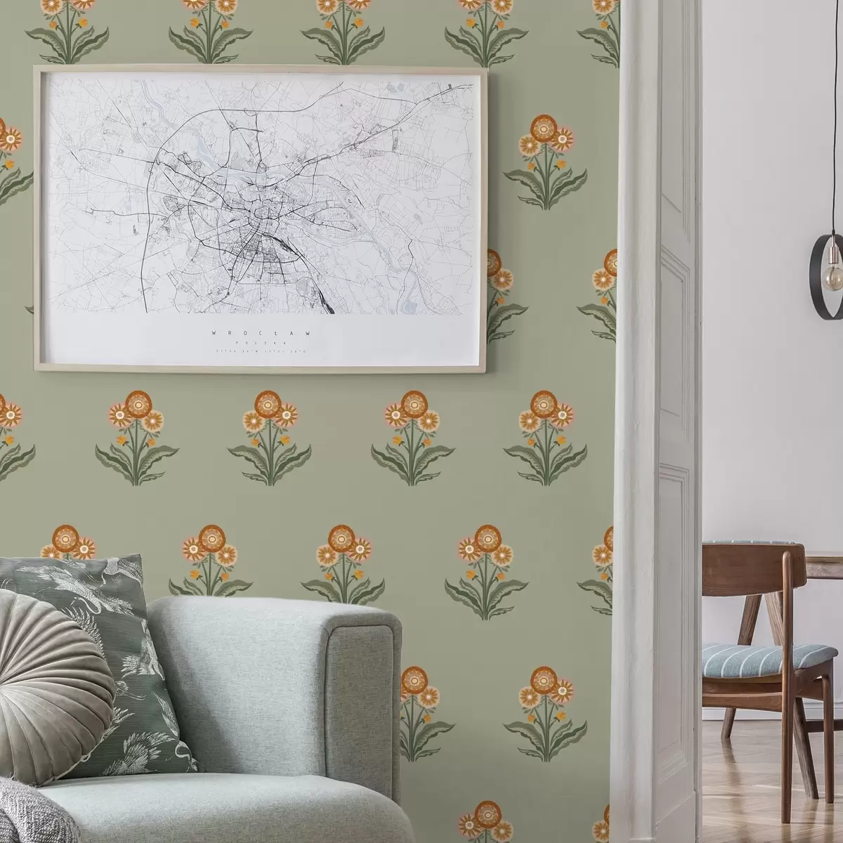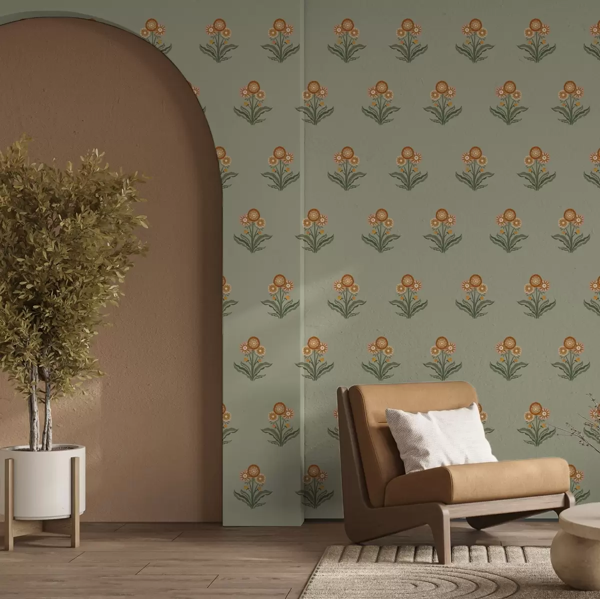 Papel tapiz Flores estilizadas sobre fondo oliva, tonos cálidos Nr. a00494v2
