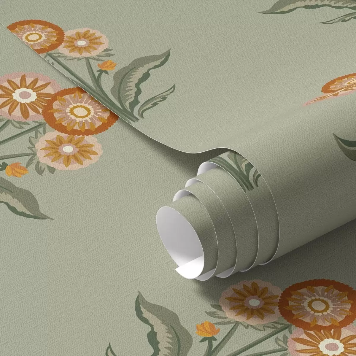 Papel tapiz Flores estilizadas sobre fondo oliva, tonos cálidos Nr. a00494v2