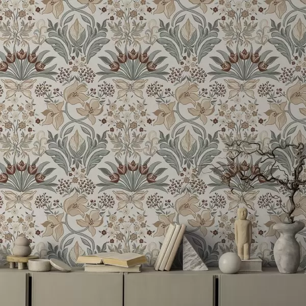 Papel tapiz Lirios decorativos y una mariposa sobre fondo crema Nr. a00500