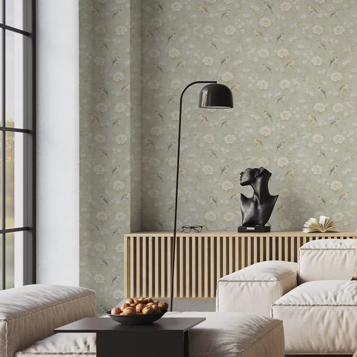 Papel tapiz Pájaros entre flores blancas sobre un fondo gris verdoso Nr. a00583
