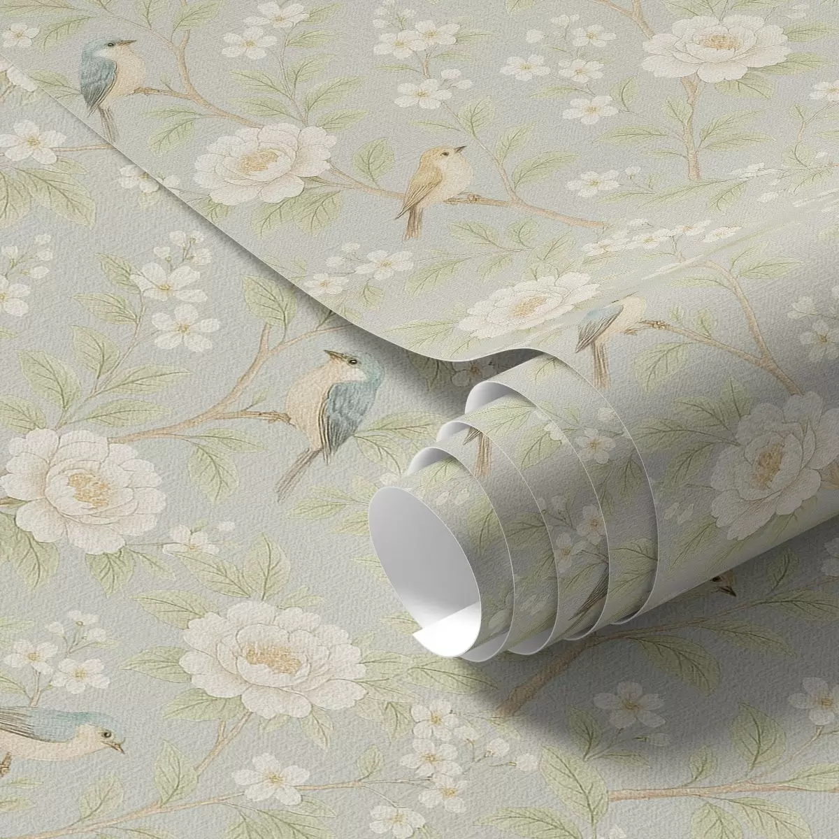 Papel tapiz Pájaros entre flores blancas sobre un fondo gris verdoso Nr. a00583