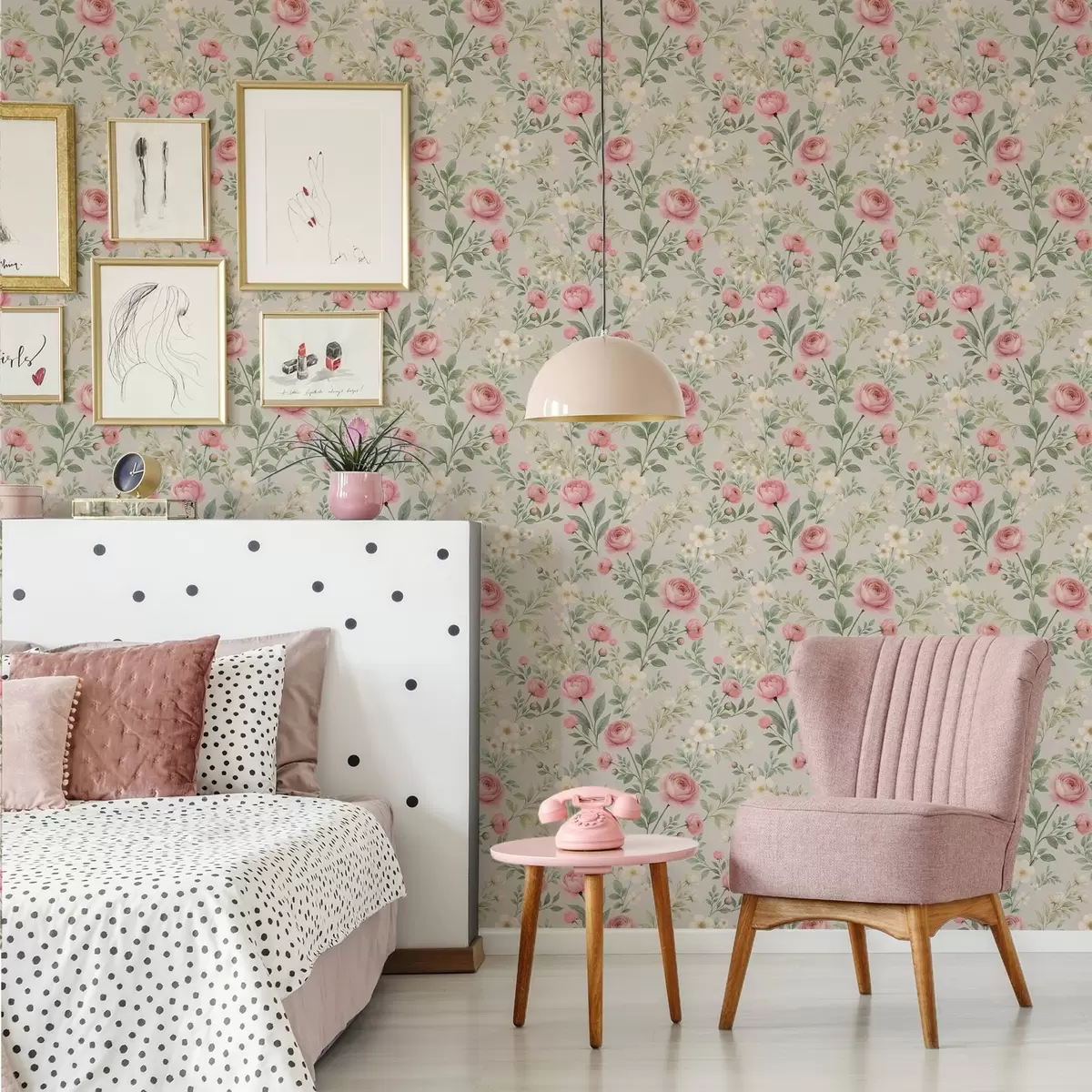 Papel tapiz Peonías y flores blancas en acuarela sobre fondo gris-beige Nr. a00592