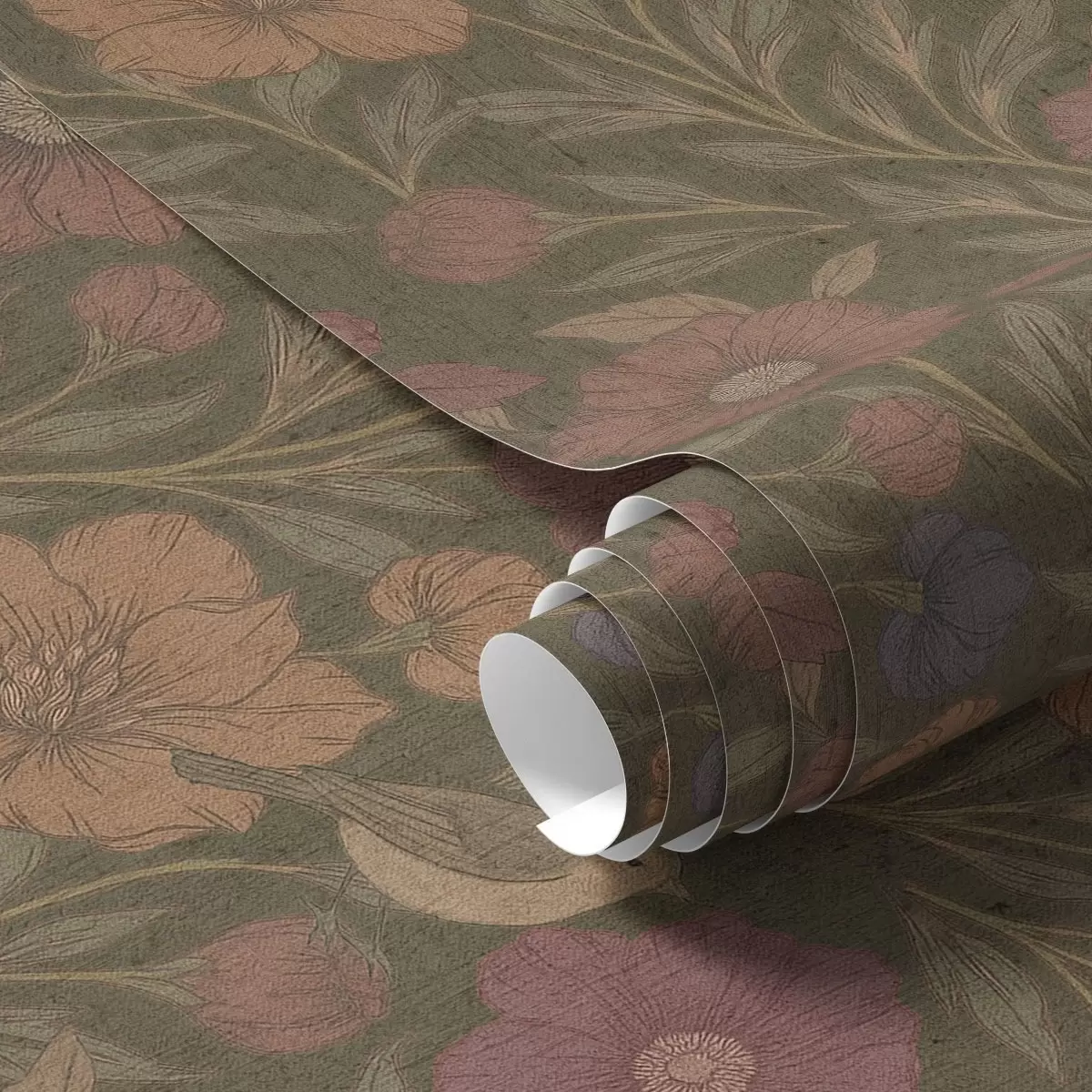 Papel tapiz Flores otoñales y pájaros sobre fondo marrón oliva Nr. a00605