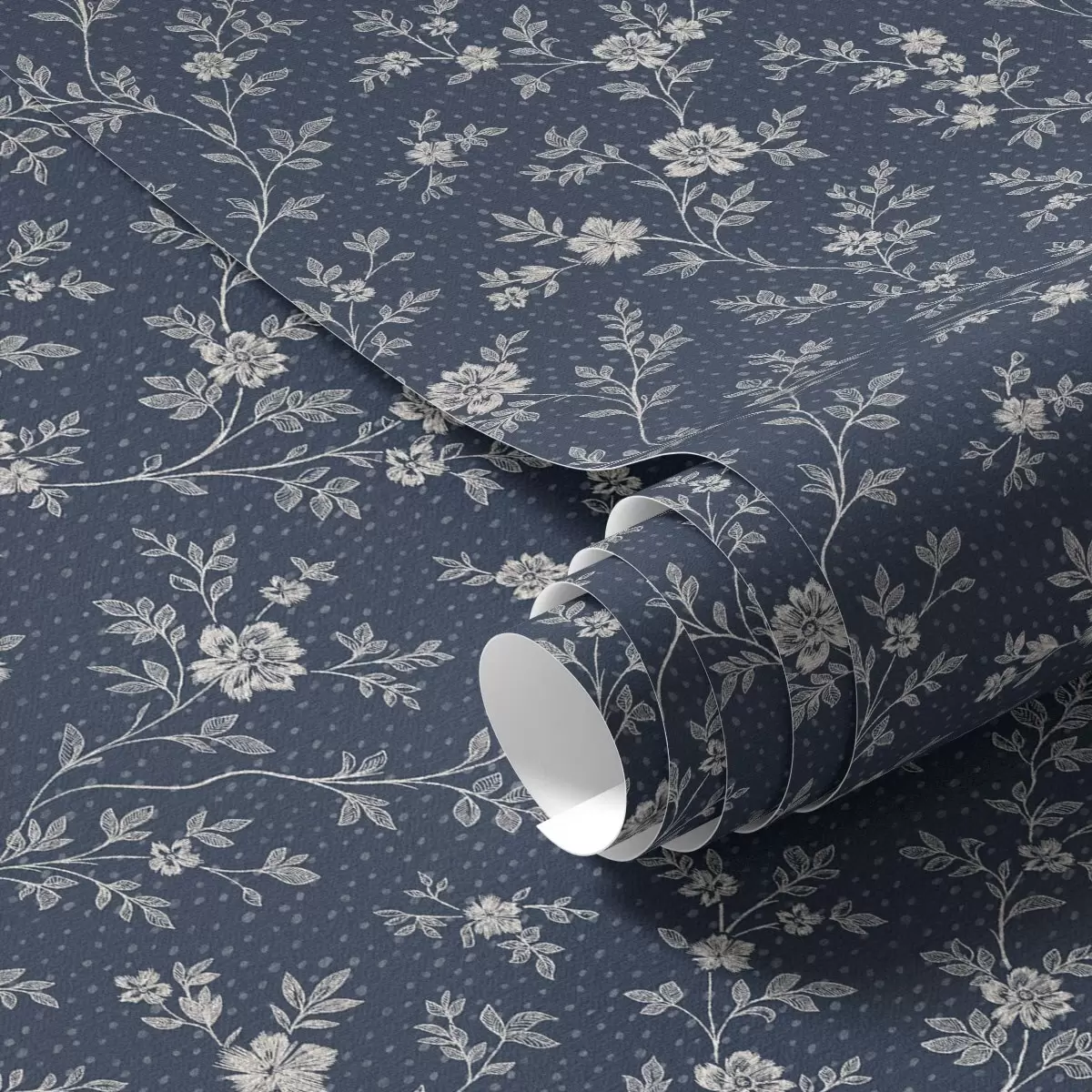 Papel tapiz Fondo azul marino oscuro con finas ramas y flores de color beige Nr. a00612