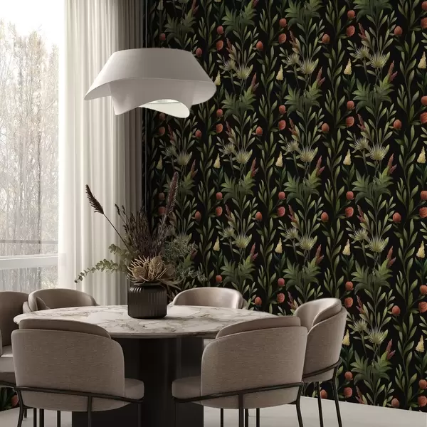 Papel tapiz Hierbas altas y flores sobre fondo negro, estampado detallado Nr. a00620
