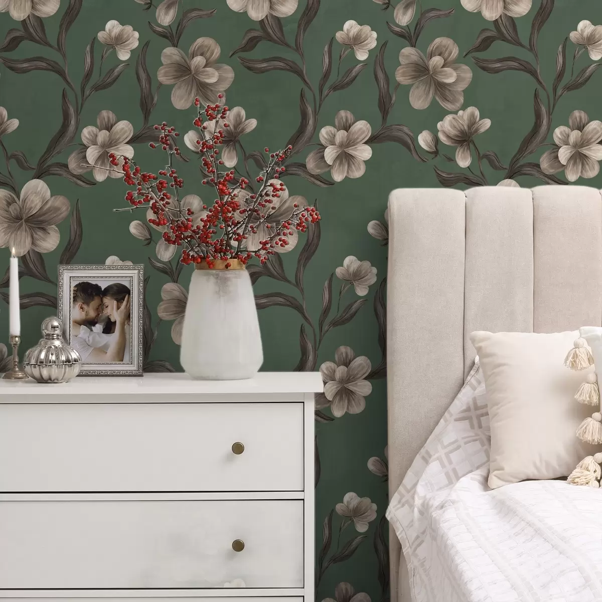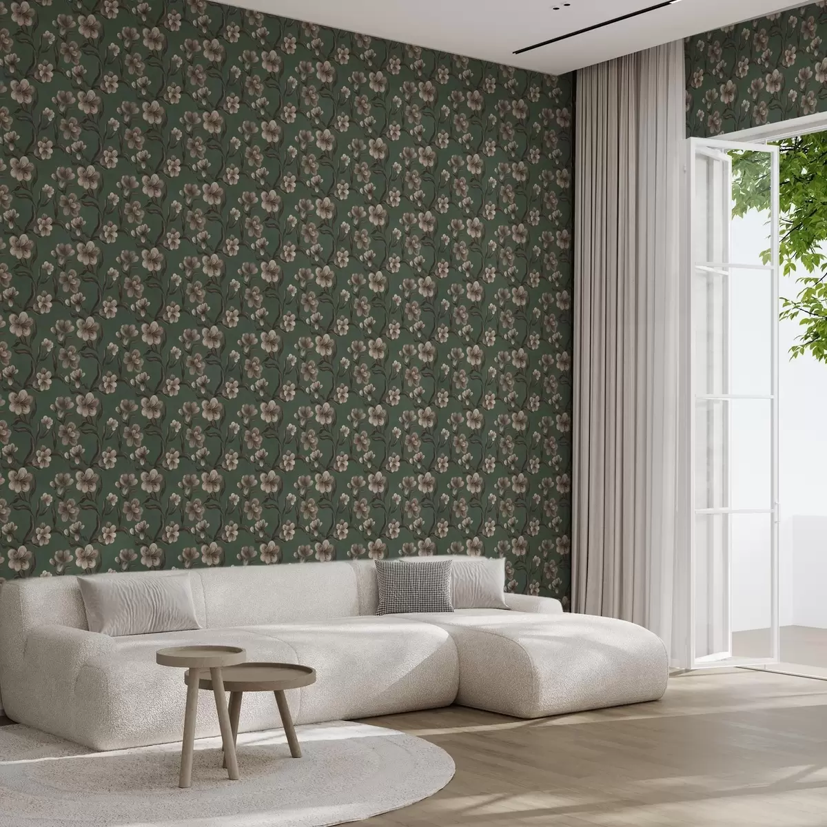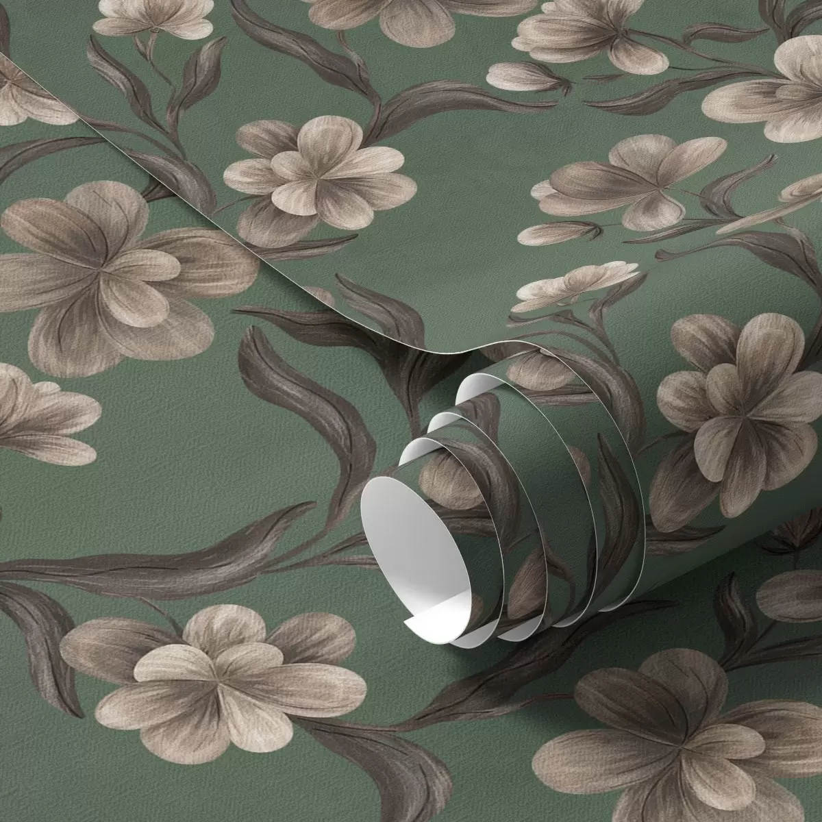 Papel tapiz Flores beige sobre un fondo verde intenso Nr. a00626v3
