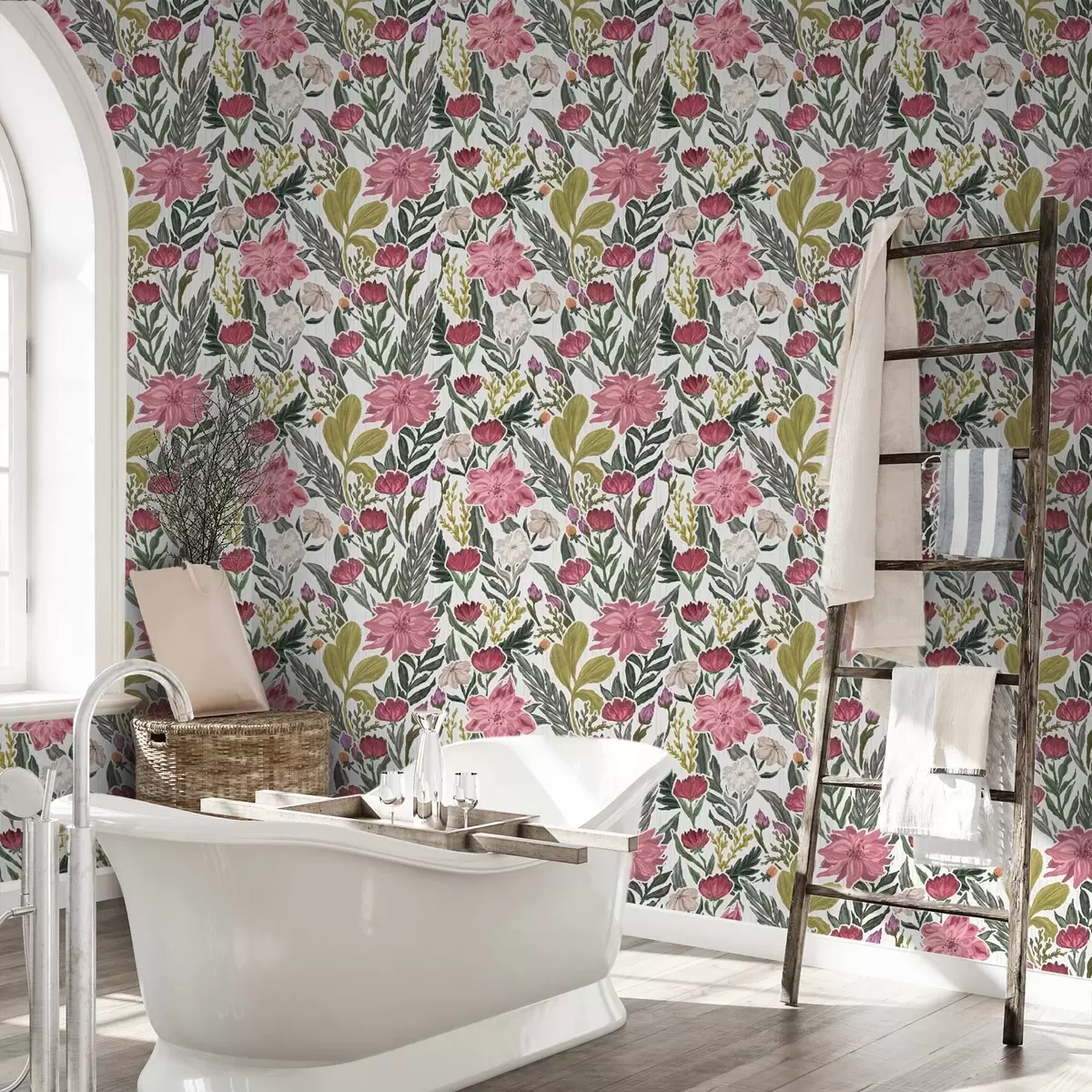 Papel pintado Exuberantes flores rosas y crema sobre fondo blanco, textura impasto a00629v1