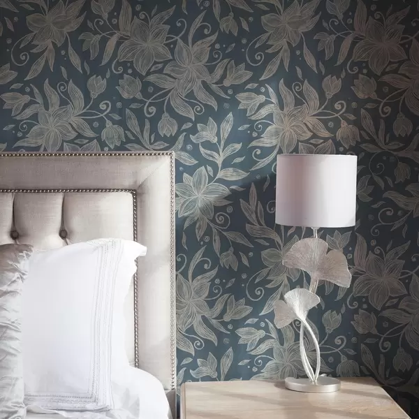 Papel tapiz Flores lineales color crema sobre fondo azul, delicados arabescos Nr. a00630