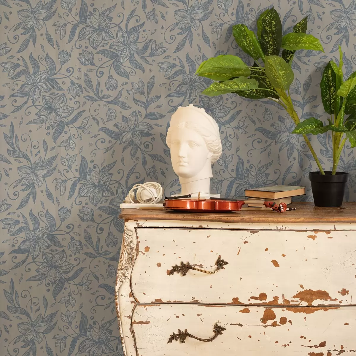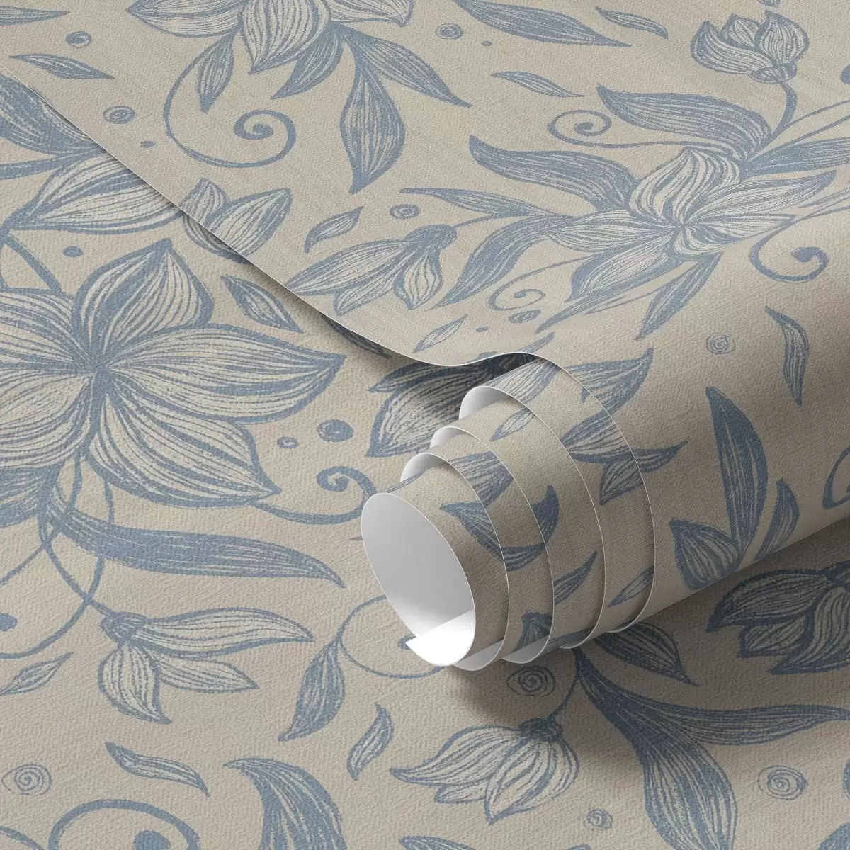 Papel tapiz Estampado floral lineal azul sobre fondo beige cálido Nr. a00630v2