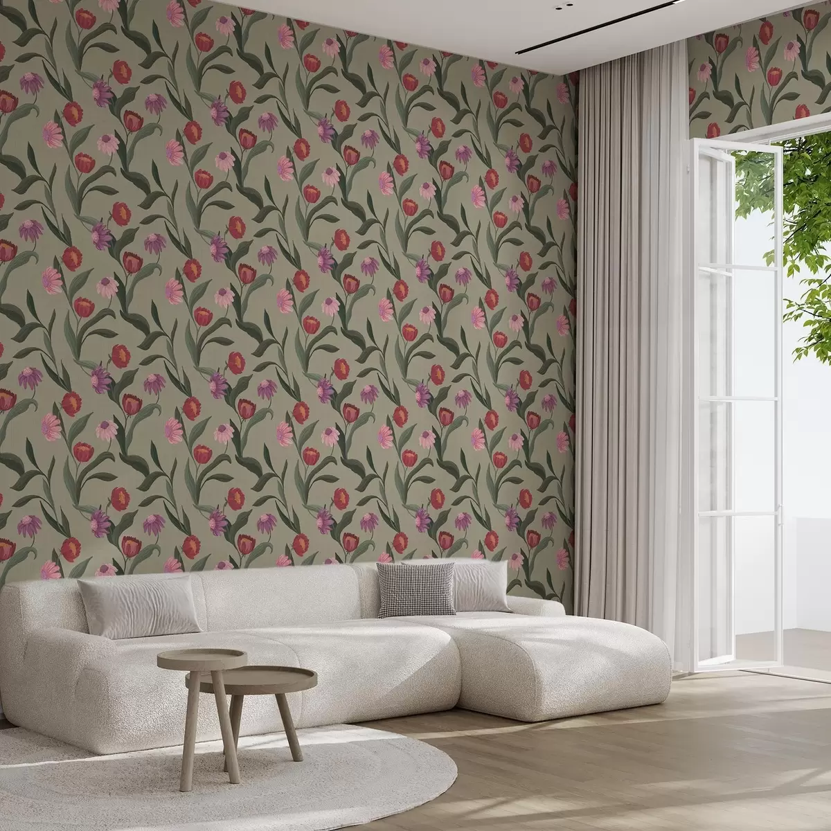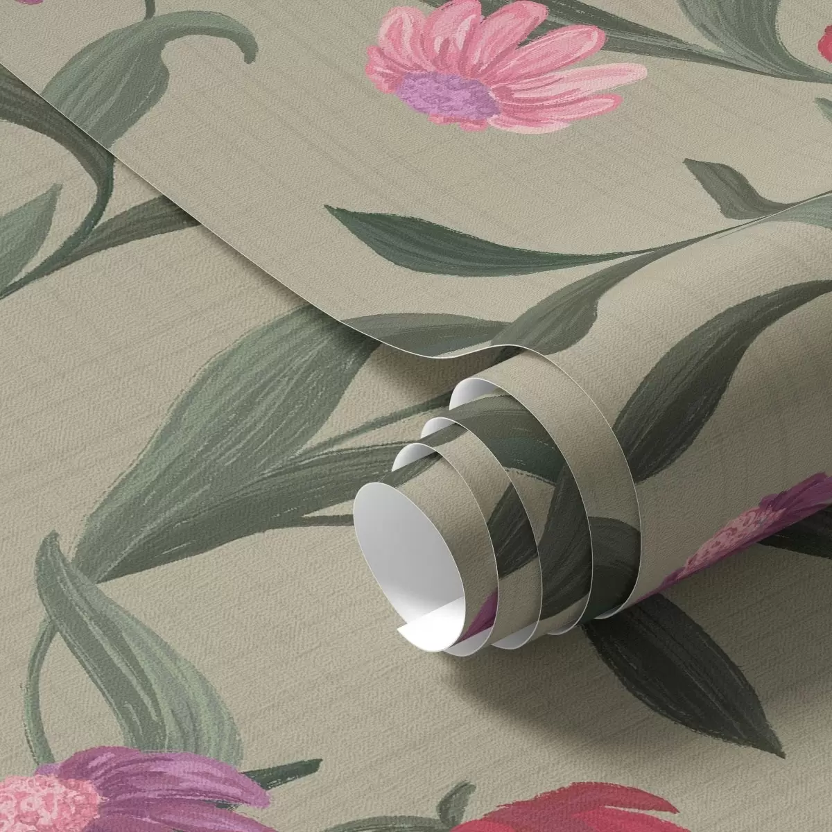 Papel tapiz Flores de color rosa rojizo sobre fondo oliva, textura de lienzo Nr. a00631v1