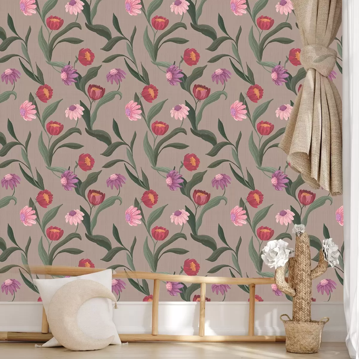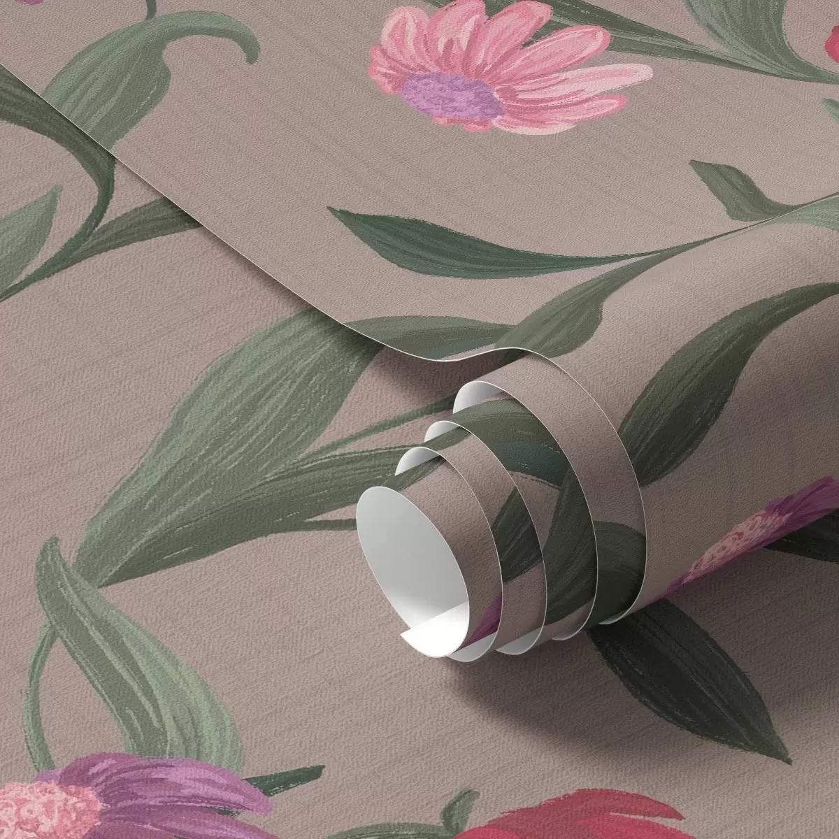 Papel tapiz Flores de color rosa rojizo sobre fondo gris pardo, tallos largos Nr. a00631v2