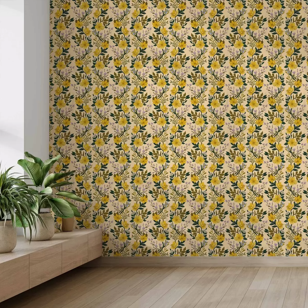 Papel tapiz Flores amarillas en guirnaldas verticales sobre fondo crema Nr. a00632