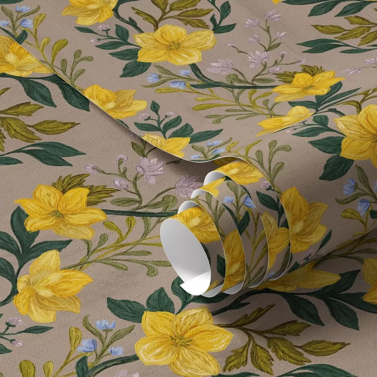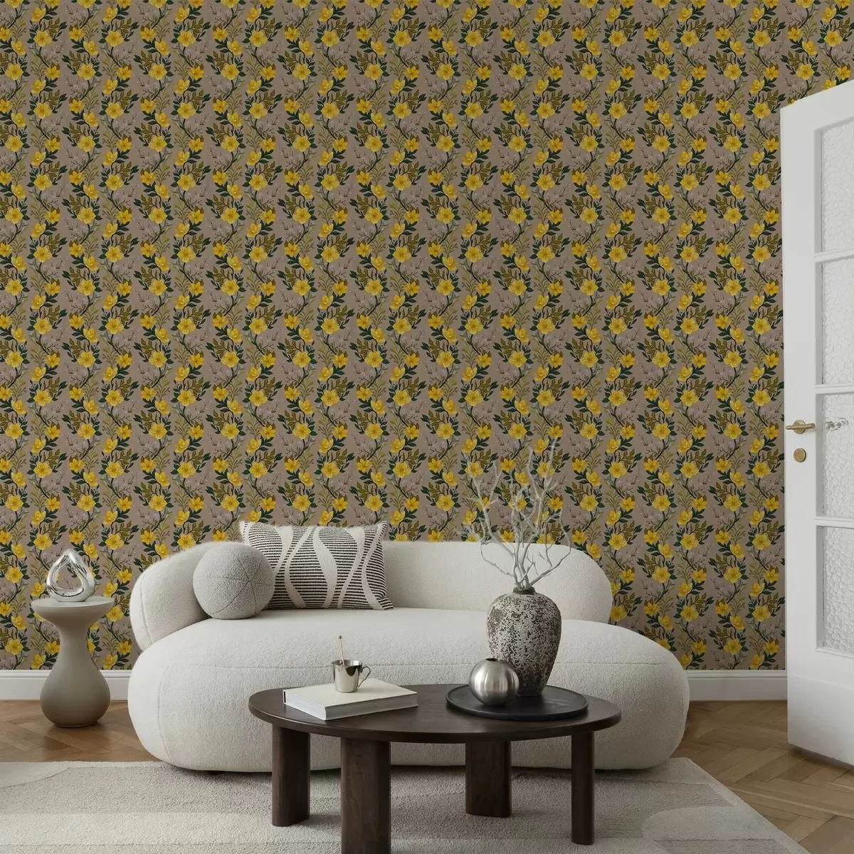 Papel tapiz Flores amarillas en guirnaldas verticales sobre fondo gris topo Nr. a00632v1