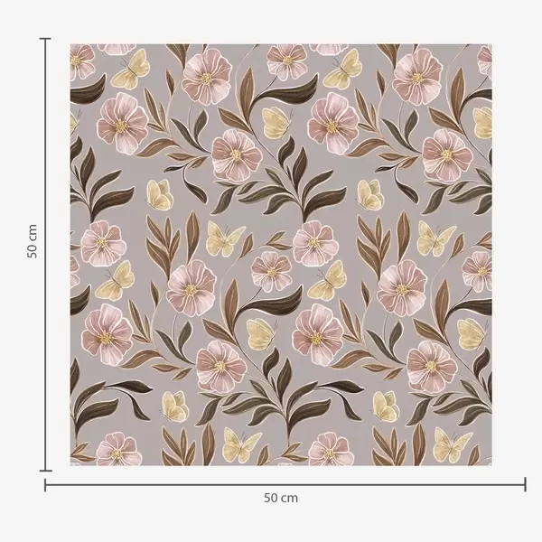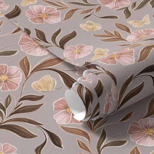 Papel tapiz Flores rosas y mariposas sobre un fondo gris-beige Nr. a00633