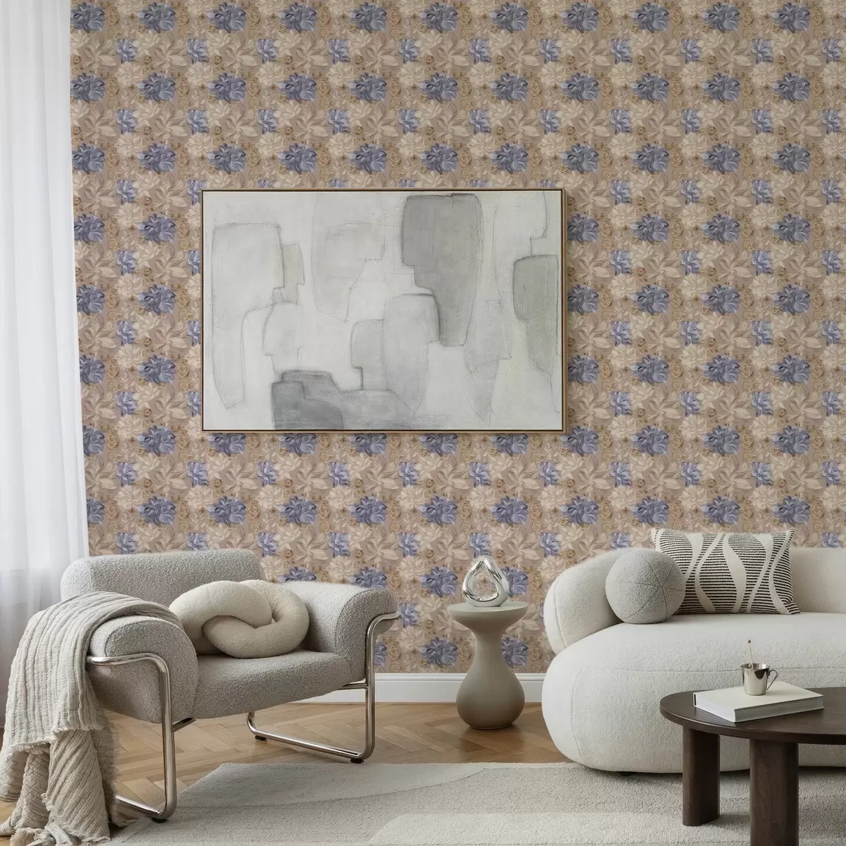 Papel tapiz Crema exuberante y flores azules en una paleta de colores pastel Nr. a00634