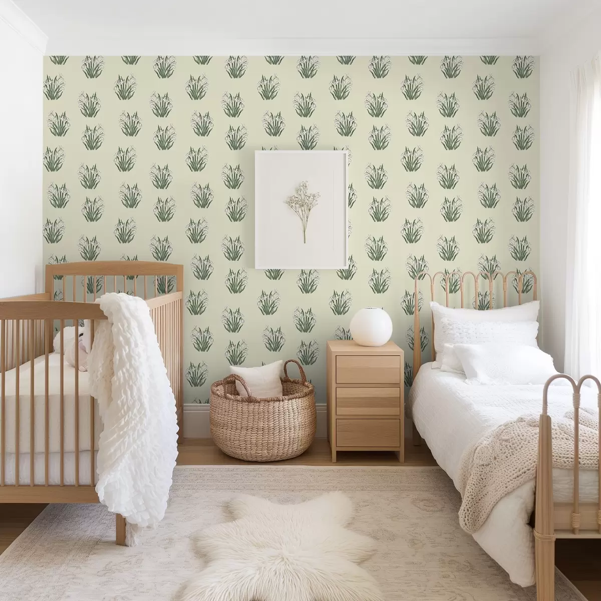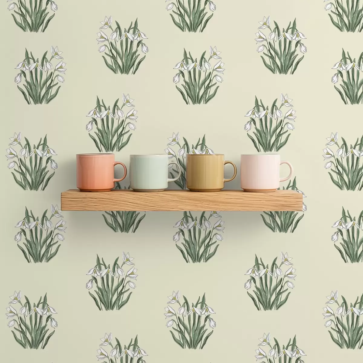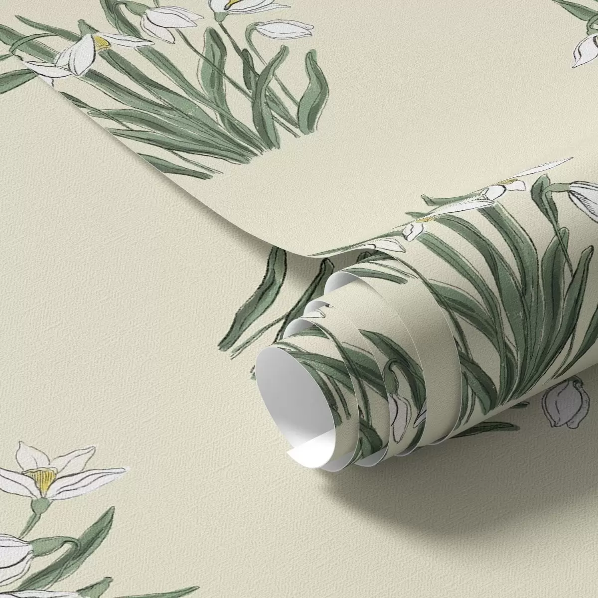 Papel tapiz Campanillas de invierno con hojas verdes sobre fondo crema Nr. a00651v2