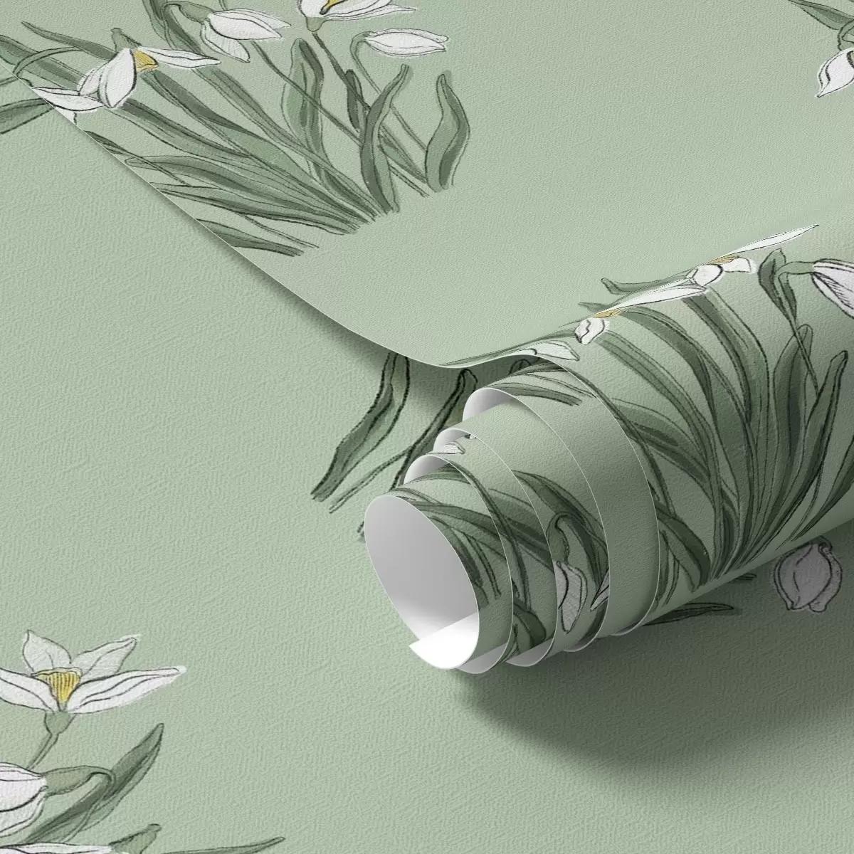 Papel tapiz Campanillas de invierno con hojas verdes sobre un fondo verde suave Nr. a00651v4