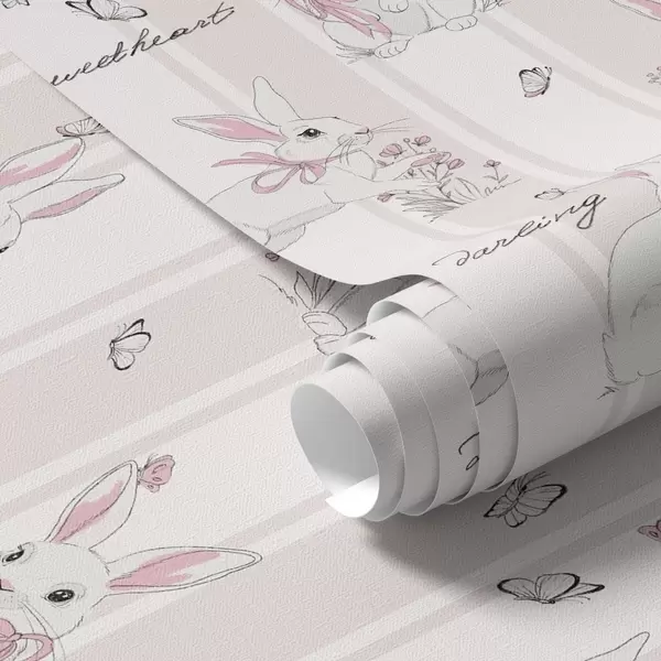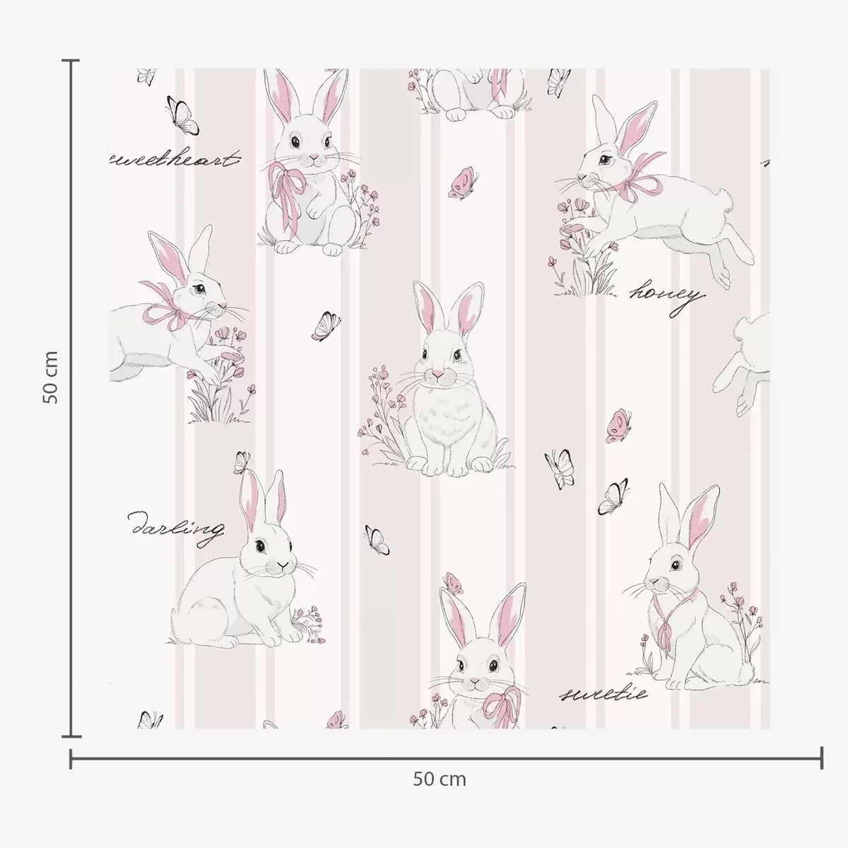 Papel tapiz Conejitos con lazos, rayas rosas y pequeñas letras. Nr. a00657