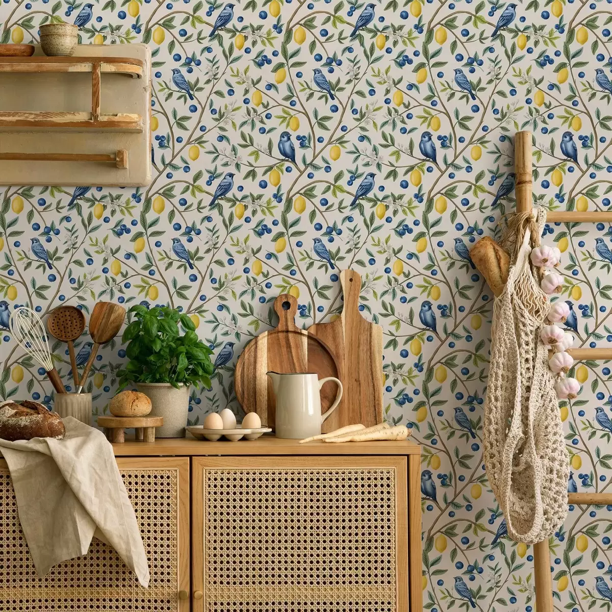 Papel tapiz Pájaros azules, limones y bayas sobre fondo blanco Nr. a00668