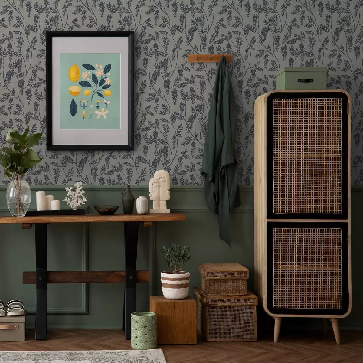 Papel tapiz Ramas con flores oscuras sobre un fondo gris-beige Nr. a00672
