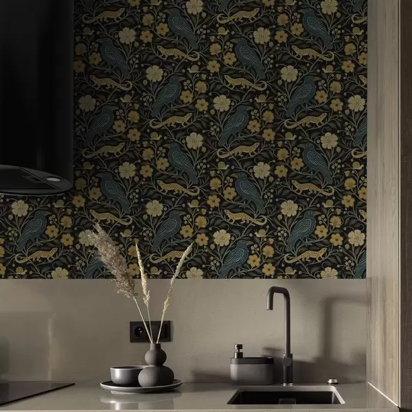 Papel tapiz Pájaros, lagartos y caracoles entre flores sobre un fondo oscuro Nr. a00691