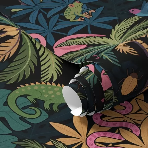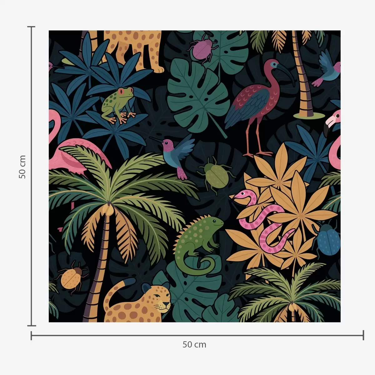 Papel tapiz Animales tropicales brillantes entre el follaje sobre un fondo oscuro Nr. a00701