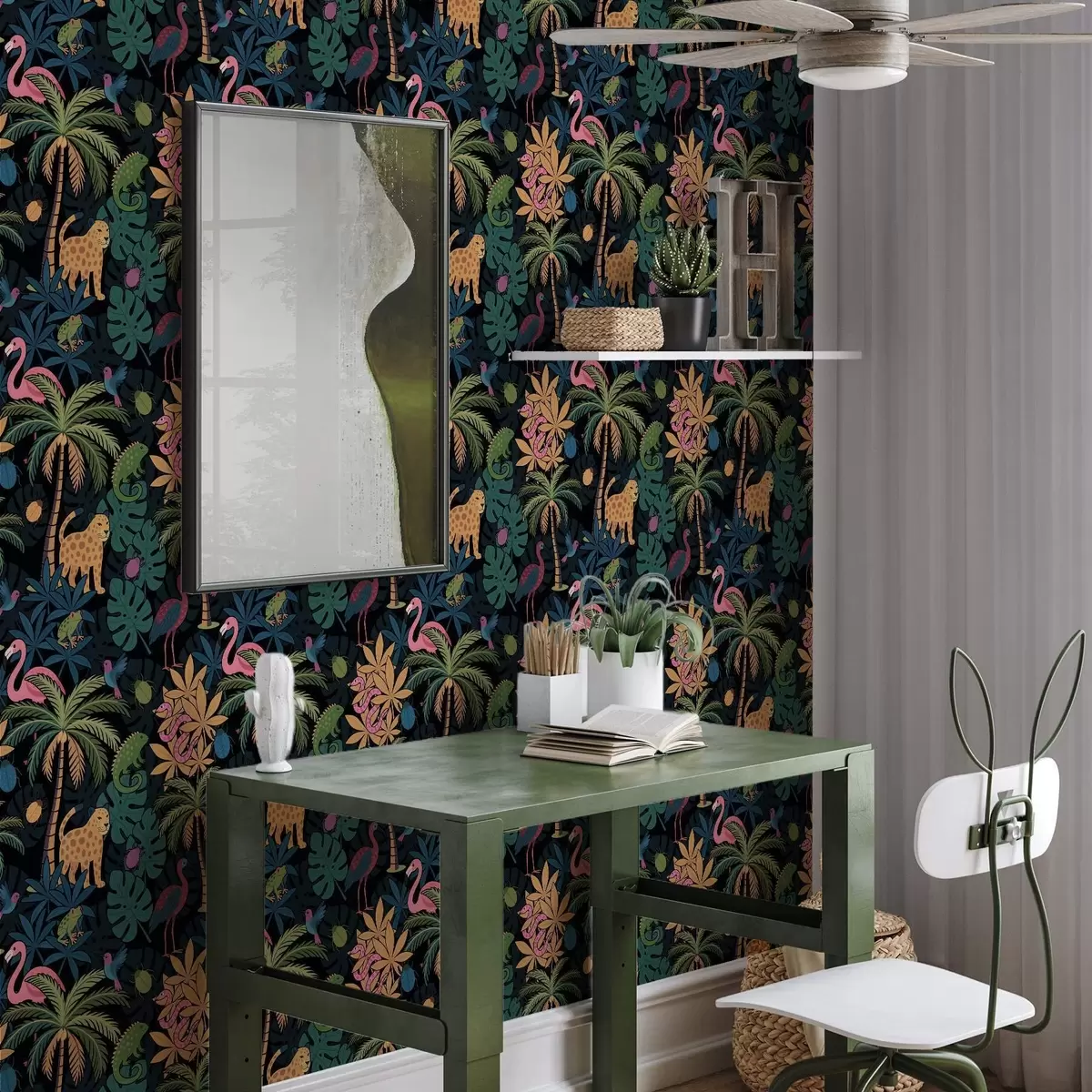 Papel pintado Animales tropicales brillantes entre el follaje sobre un fondo oscuro a00701