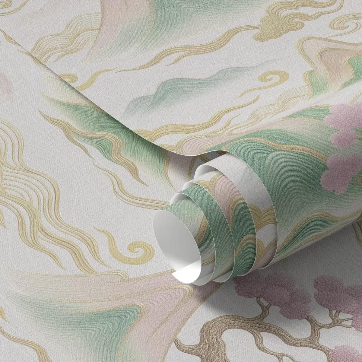 Papel tapiz Montañas, nubes y pinos en un estilo decorativo oriental Nr. a00703