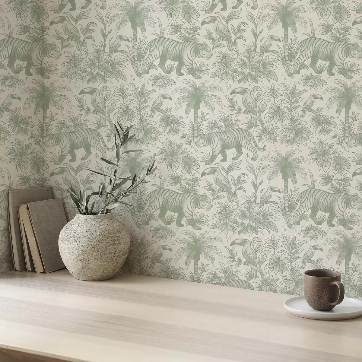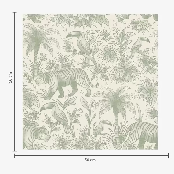 Papel tapiz Tigres y aves tropicales entre palmeras sobre un fondo claro Nr. a00711