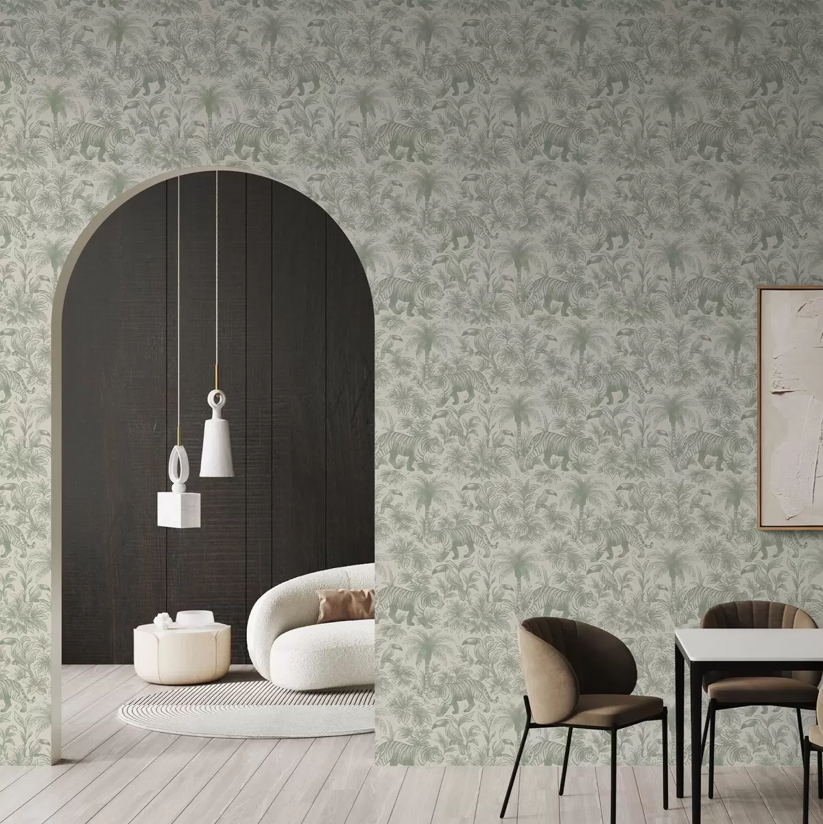 Papel tapiz Tigres y aves tropicales entre palmeras sobre un fondo claro Nr. a00711