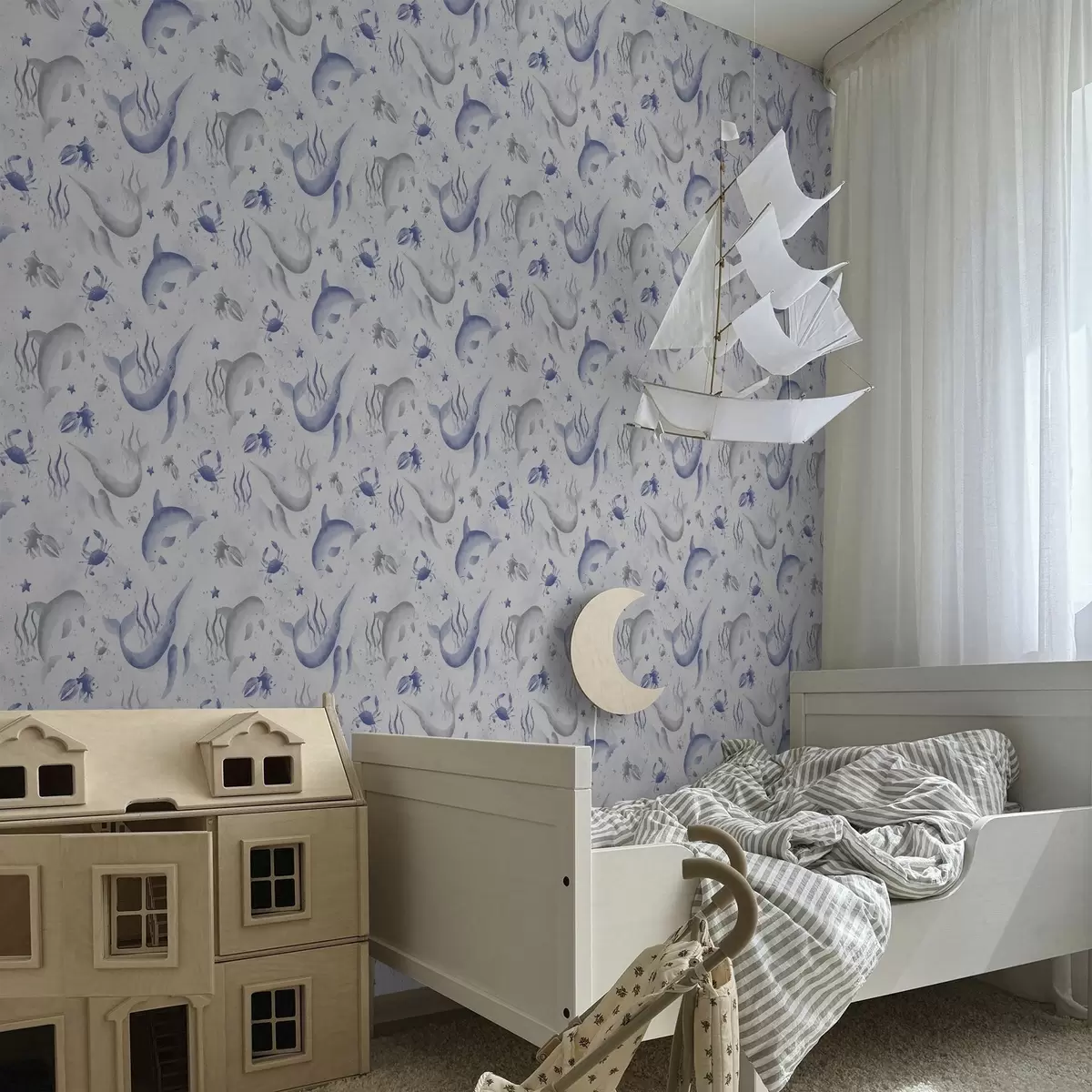 Papel tapiz Ballenas marinas y delfines en tonos azules sobre fondo blanco Nr. a00720v1