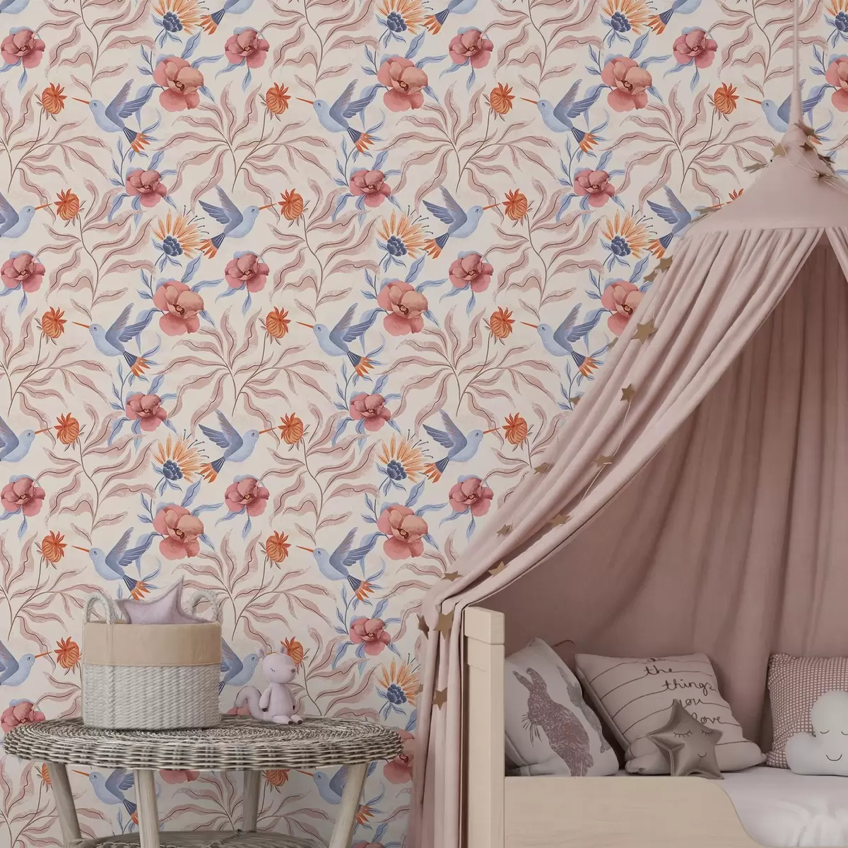 Papel tapiz Colibríes entre grandes flores en tonos rosados y azules Nr. a00733