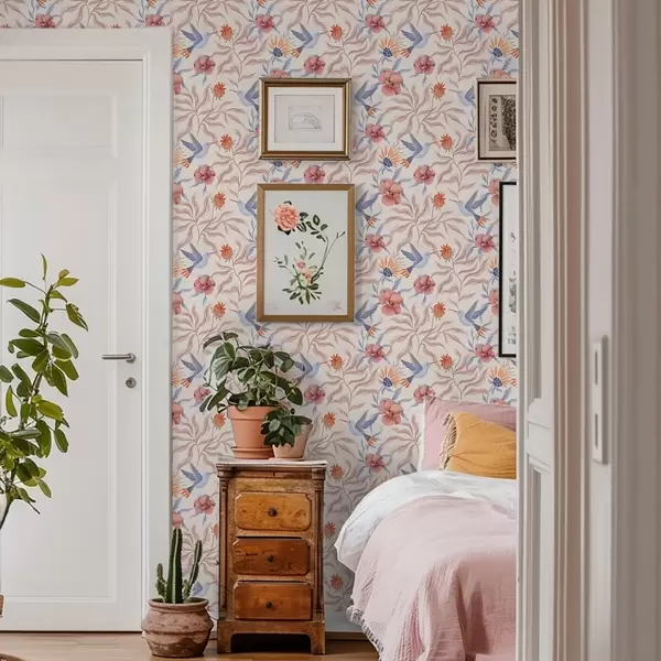 Papel tapiz Colibríes entre grandes flores en tonos rosados y azules Nr. a00733