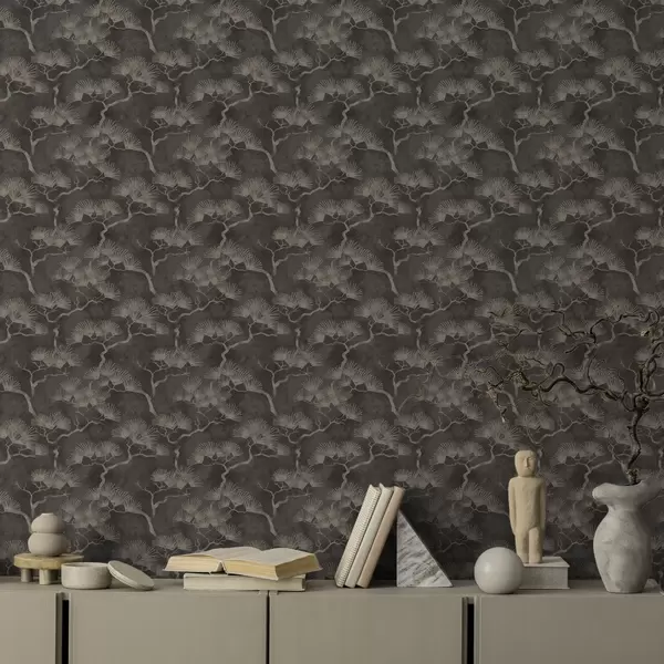 Papel pintado Siluetas de pinos sobre fondo oscuro, textura brumosa a00742