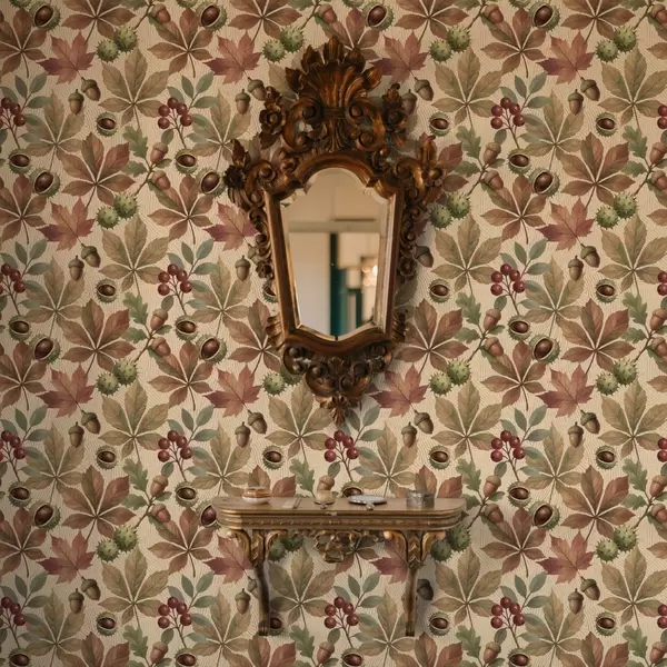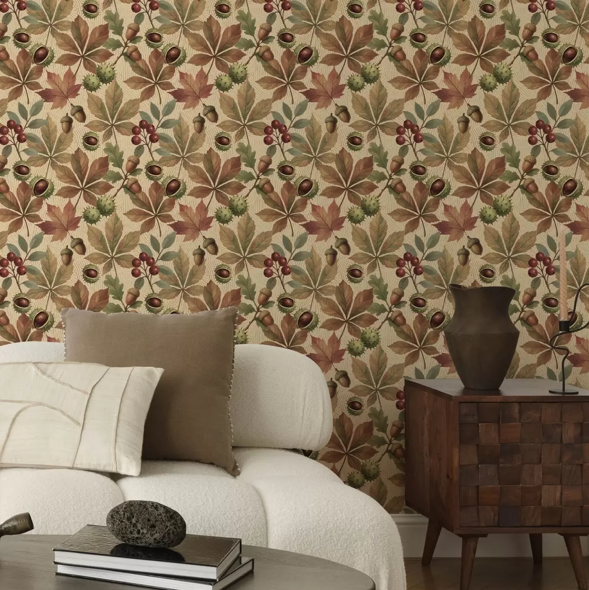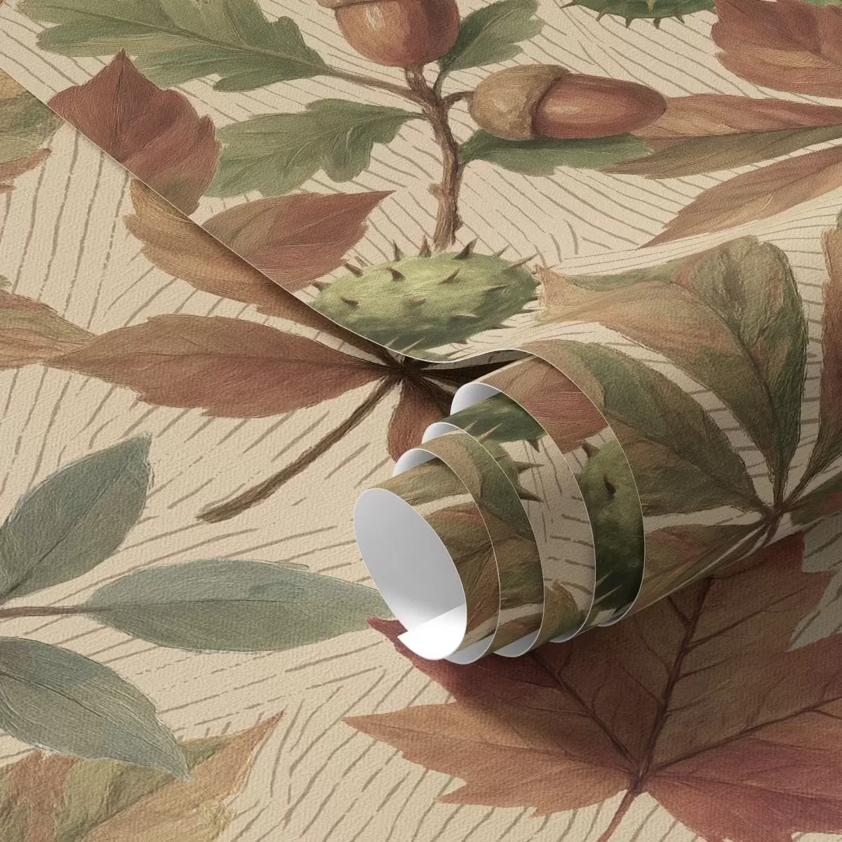 Papel tapiz Hojas otoñales, bellotas y bayas sobre fondo beige Nr. a00754